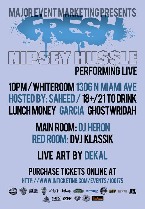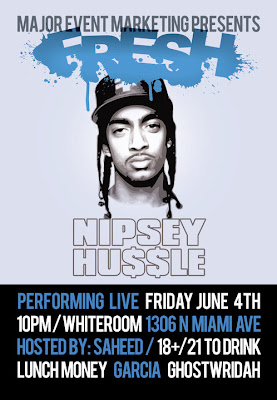 Friday night June 4th come out and see Nipsey Hussle, Lunch Money, Ghostwridah & Saheed at the white room. All presented by Major Event Marketing and sponsored of course by 8&9 Clothing!