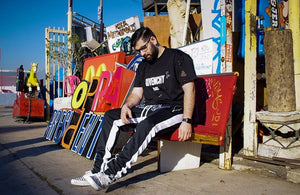 The premium Dream Qrew Double Stripe track pants are extremely limited and will not restock! Heavy poly, reminiscent of vintage NBA warm ups, heavy knit rib, high-grade zip pockets and legs. Double striped track pant with extended cotton drawcords. Official Qias Omar Drew Crew Merchandise!