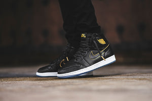 This Air Jordan 1 features black tumbled leather, metallic gold accents, Los Angeles map-inspired graphic insoles, and an icy blue translucent outsole to complete the look.