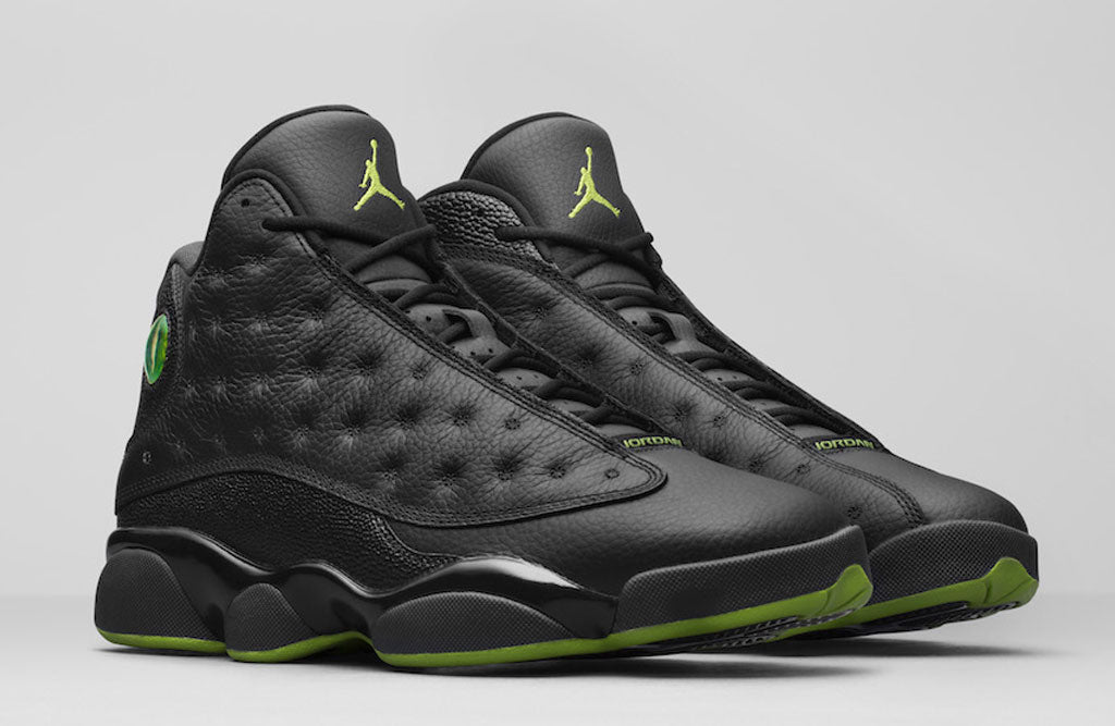 Dressed in its original colors a Black and Altitude Green color scheme. This Air Jordan 13 will look just like the first launch featuring a full leather upper. A textured overlay wraps the sides and heels, to finish the look is a Green rubber outsole.