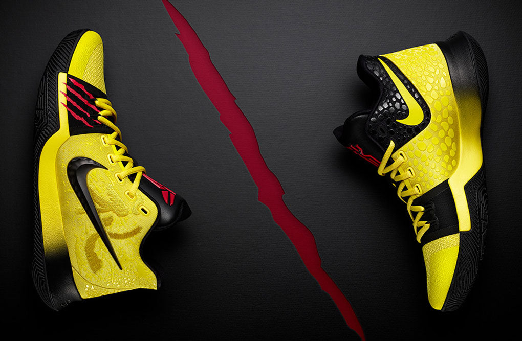 Kyrie first wore the Kobe V Bruce Lee during a Nike tournament and instantly fell in love with the shoe.This Nike Kyrie 3 is inspired by the Nike Kobe 5 Bruce Lee that released back in 2009.The new Kyrie 3 Bruce Lee features elements that modernize the original Kobe 5, which remains one of Irving’s all-time favorite shoes.