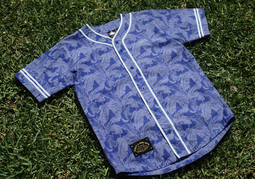 Permanent Vacation, Miami Life. A light twill baseball jersey for beach days and loungin. Tonal pattern, dice embroidery and the black tag treatment.