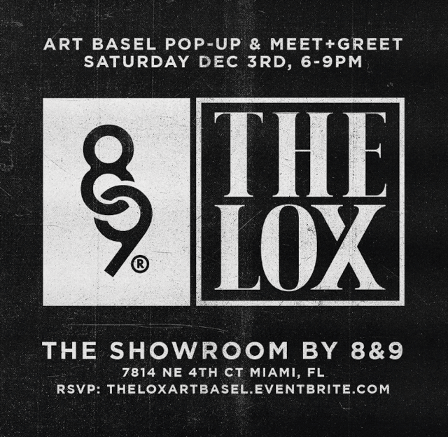 The LOX are invading Miami for Art Basel weekend with 8&9! Join us, along with Jadakiss, StylesP, and Sheek Louch Saturday Dec. 3rd at the 8&9 Showroom to check out what we've been cooking up together along with brand new styles and designs by 8&9. Located at 7814 NE 4th Ct. Miami, FL 33138. 6pm-9pm.
