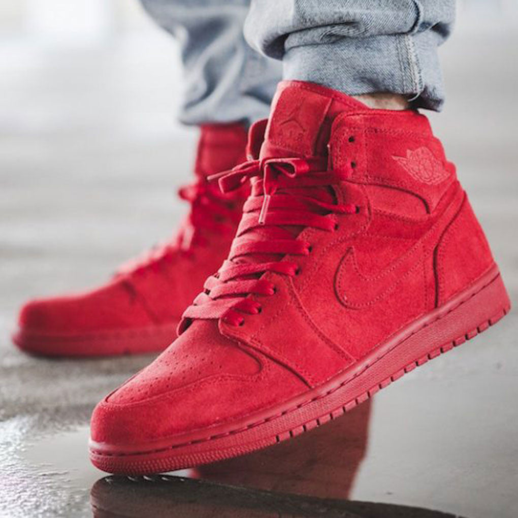 You can never go astray with a all red silhouette if your have been waiting for a chance to see the Jordan 1 in all red here it is. This Air Jordan 1 comes in full Gym Red. Built with a premium suede upper, and completed with a full-length rubber sole. With original Jordan branding this shoe will be sure to catch your eyes.