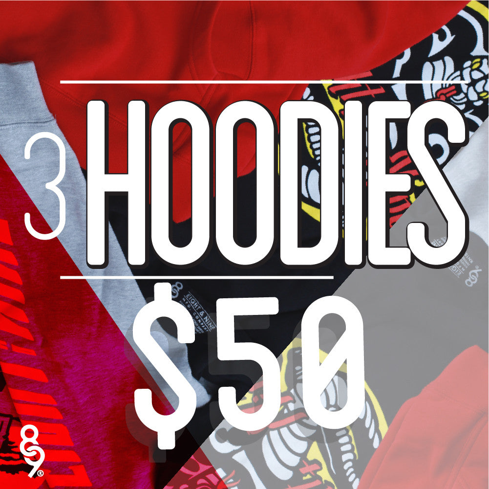 This is a limited offer while supplies last! 3 different 8&9 hooded sweatshirts for only $50. S - 3X packs are available. How can we do this? Making space in our warehouse is easier than finding a new one so we're grabbing 3 hoodies in your size and shipping them out for $50. For this blow out deal all sales are final, no returns or exchanges. Final sale. Quality of product and service are guaranteed.