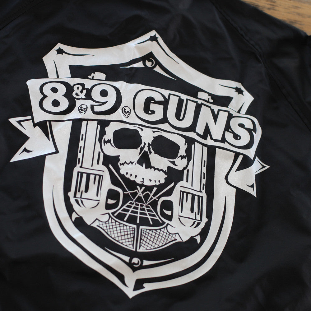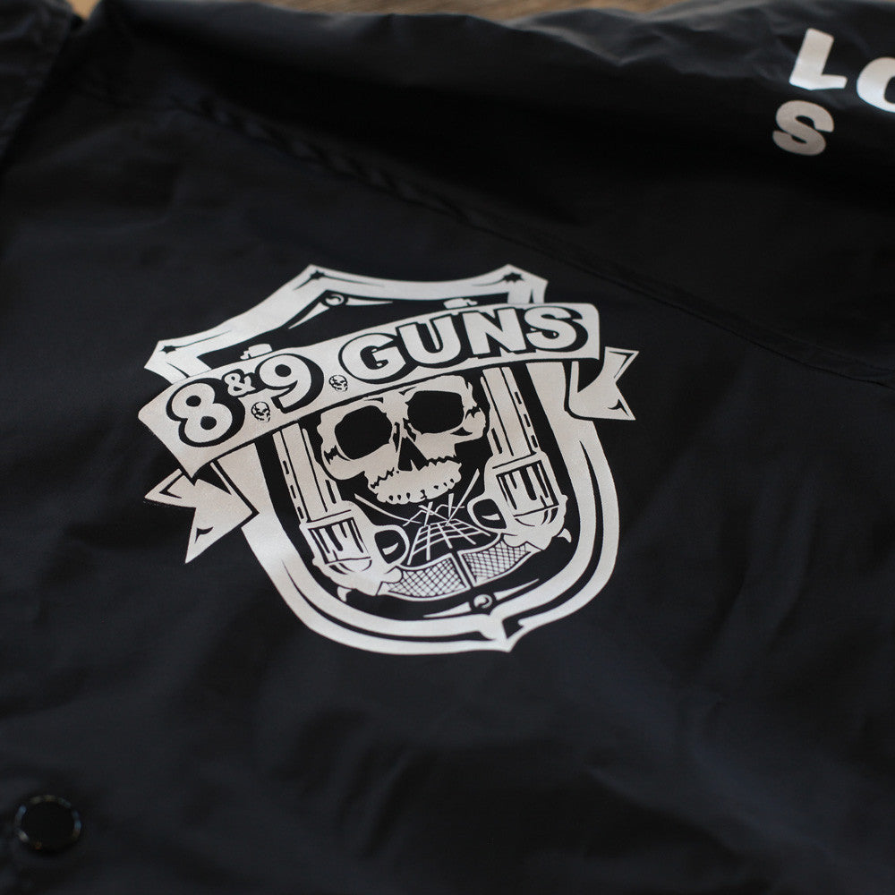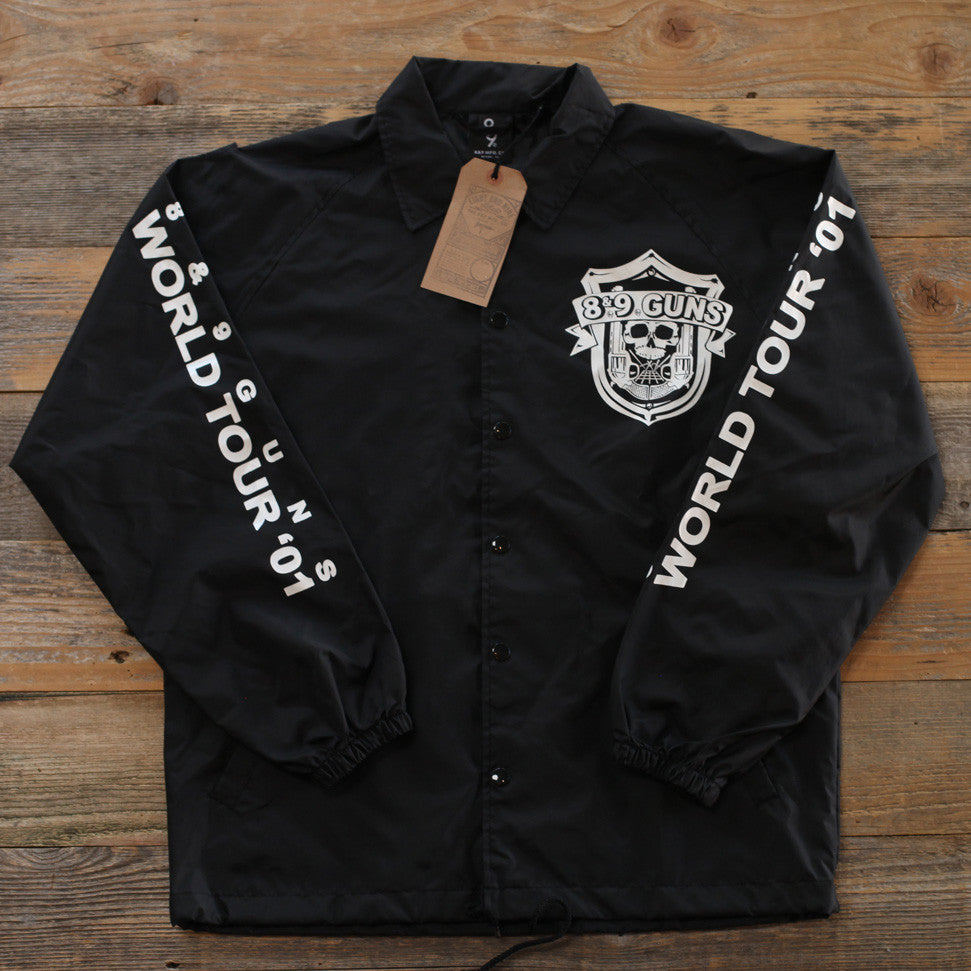Lightweight for Spring '15. 89 Guns Coaches Jacket with front, back, and sleeve hits. Inspired by 80's American rock band LA Guns. 89 Guns World Tourin since '01. 100% Nylon water repellant windbreaker. Black and white color scheme.