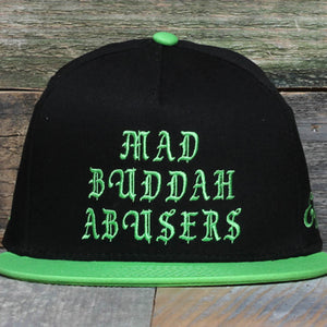 Snapback design, Mad Buddha Abusers embroidered front panel w/ side chronic leaf emblem. Black/AltitudeGreen detailing and black snapback closure.