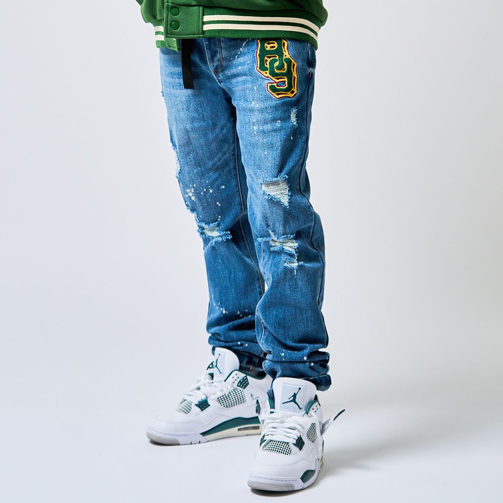 Elevate your wardrobe with our Academia Men's Jean – our classic slim fit jean that pairs well with the entire Hard Knocks collection. Features a chenille embroidered 8&9 logo on the front and distressed details.