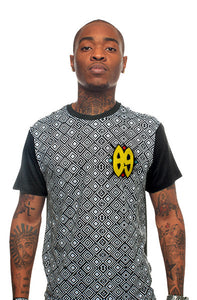 This sublimated print is inspired by one of our office favorite sneakers the Adidas Mutumbo. We've remixed the black on white geometric pattern with a custom 8&9 twist. Likewise with the original sneaker tongue art we've added the 8&9 touch. Tonal pattern accents on sleeve and back give this item a particularly lux feel.