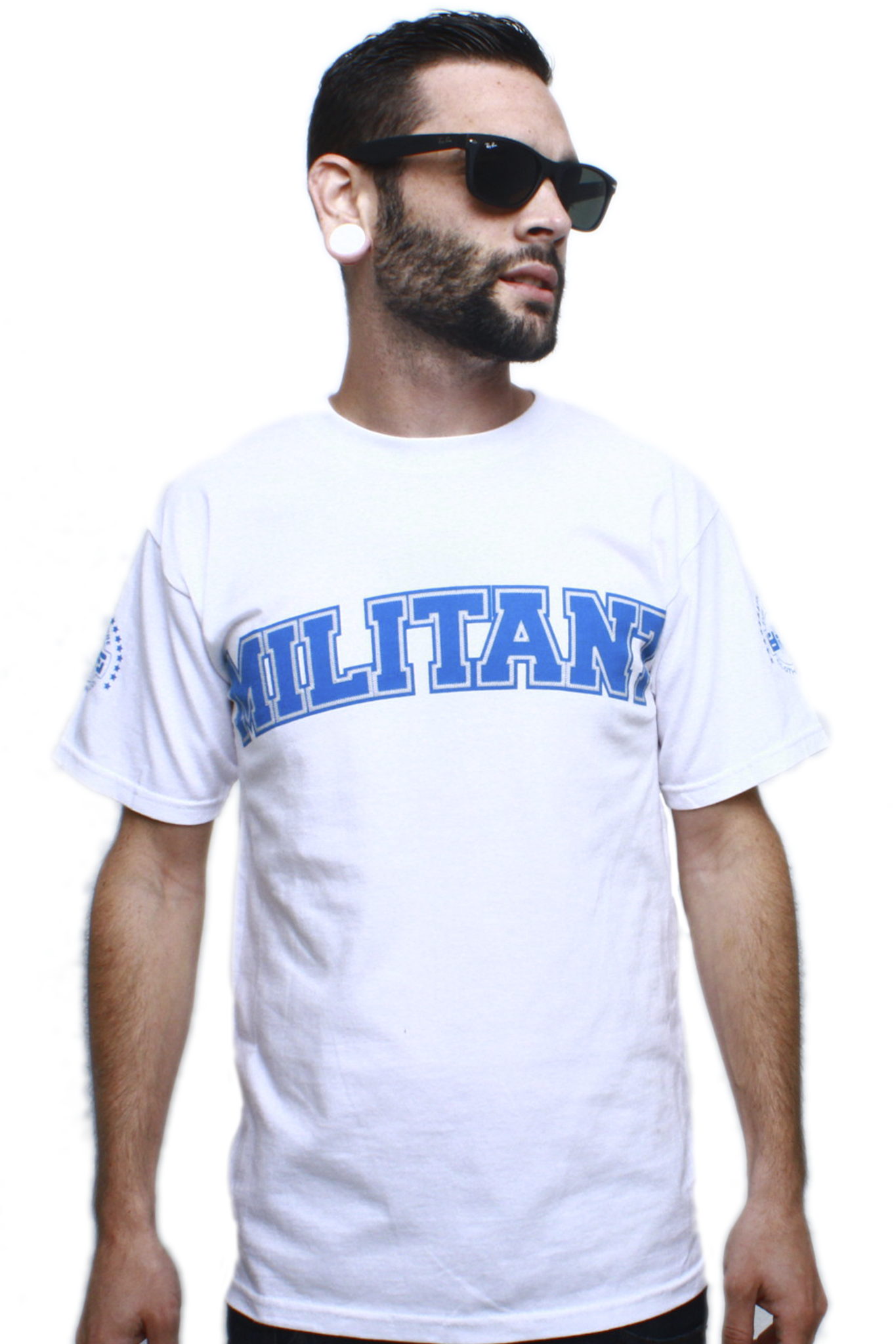 Simplicity reigns supreme.  White/Military Blue/Neutral Grey MILITANT t shirt just in time for the Military 4's. This is the shirt to match Air Jordan Military 4 OG or Retro. Look for the sneaker to release June 9.