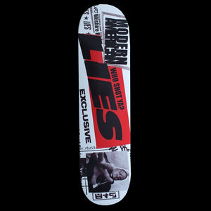 Biggie Media Conspiracy Skate Deck. Inspired by the Guns & Roses Lies tabloid album cover. This graphic addresses some of the rumors, lies and bullshit spread by the media surrounding Biggie's life and death. White/Varsity Red/Black