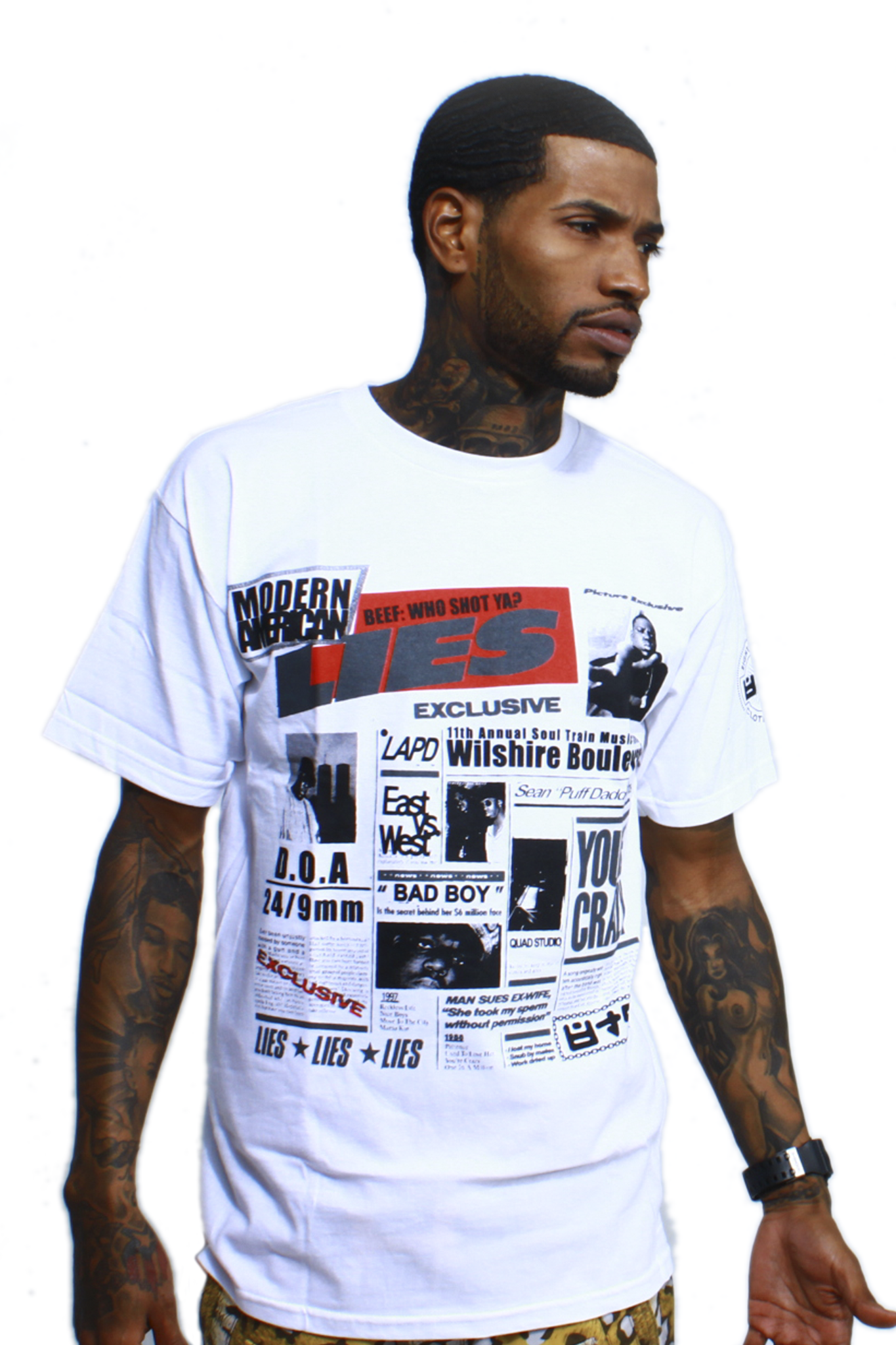 Biggie Media Conspiracy T Shirt. Inspired by the Guns & Roses Lies tabloid album cover. This tee addresses some of the rumors, lies and bullshit spread by the media surrounding Biggie's life and death. White/Varsity Red/Black