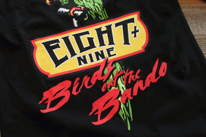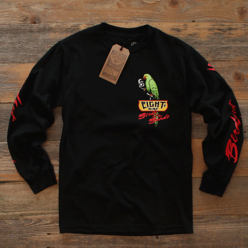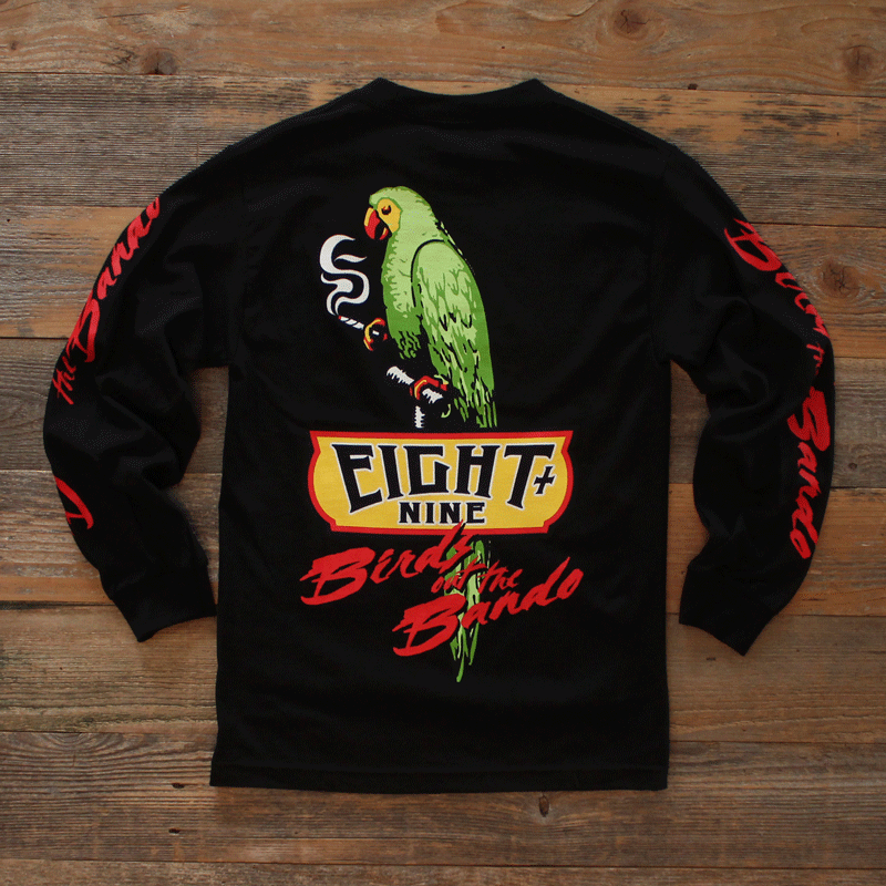 New for spring '15 ultra soft premium Birds Out The Bando long sleeve tee. Jet black tee with bright yellow/green/red tropical scheme. Front, back and two sleeves hits. Clean. Get yours. #8and9life