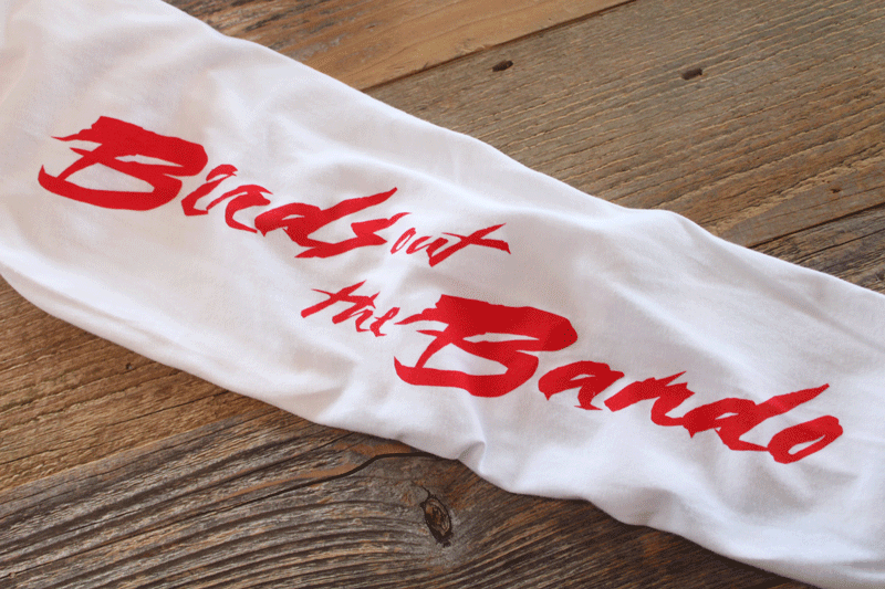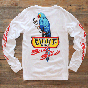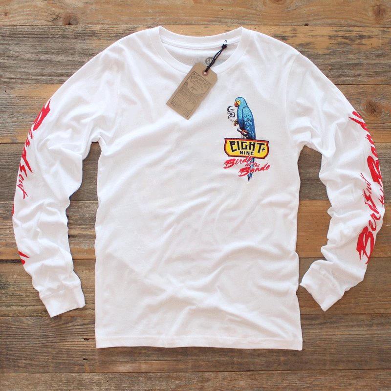 New for spring '15 ultra soft premium Birds Out The Bando long sleeve tee. Print includes french blue with sport red and yellow. Front, back and two sleeves hits. Clean. Get yours. #8and9life