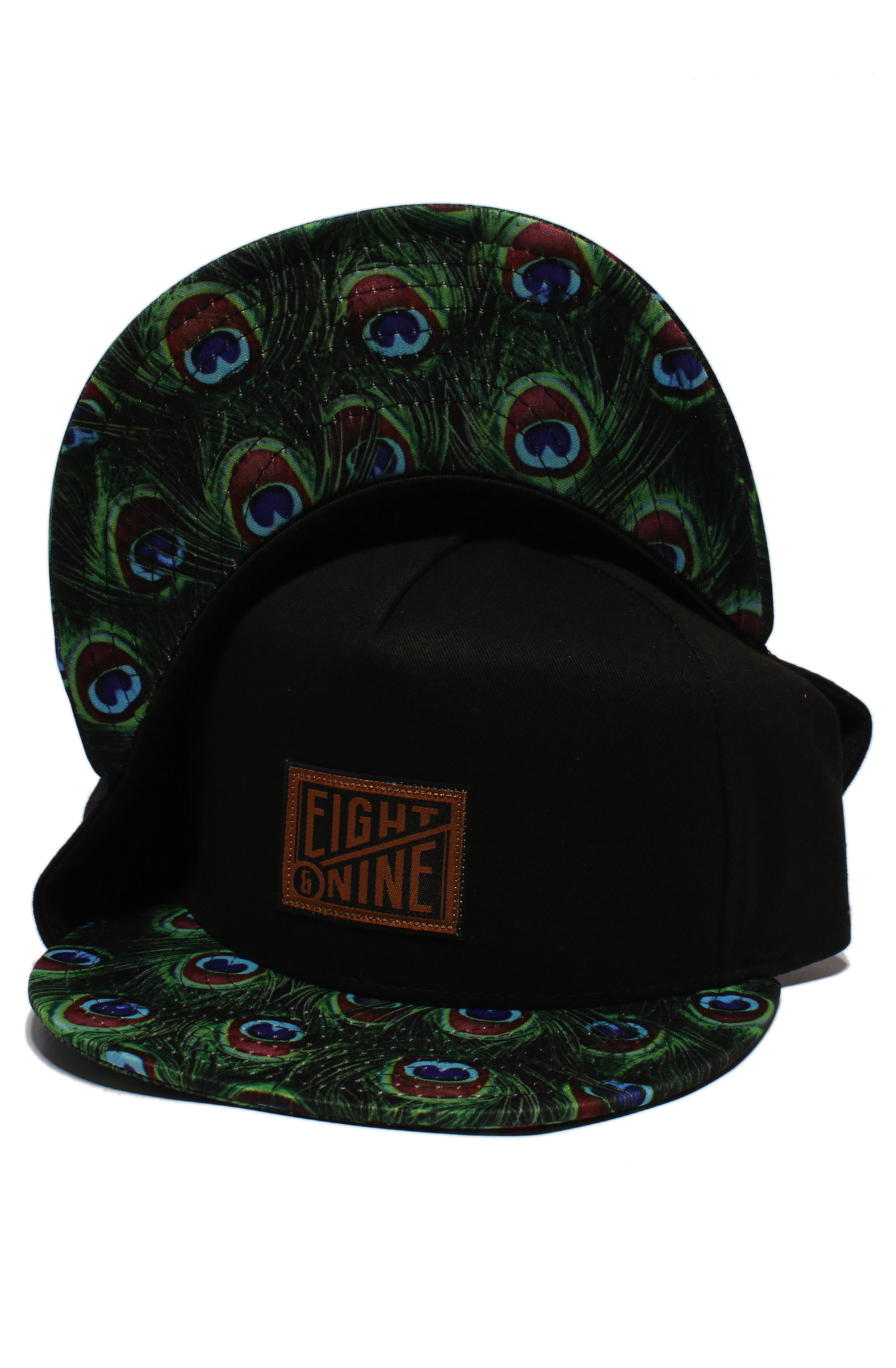 Flat brim baseball hat with peacock print visor & strapback closure. Top and under visor are printed. Stitched eyelets; Eight & Nine logo patch on front; adjustable strap w/ metal buckle closure; S logo tag in back; 100% cotton.