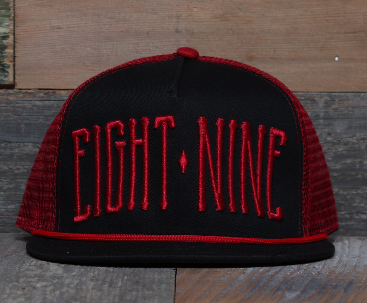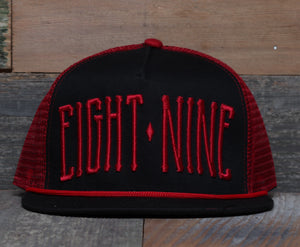 Bred aka Black/Red Mesh Trucker Snapback Baseball hat with block Eight & Nine logo. This is a perfect cap to match the Jordan Bred 11.