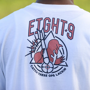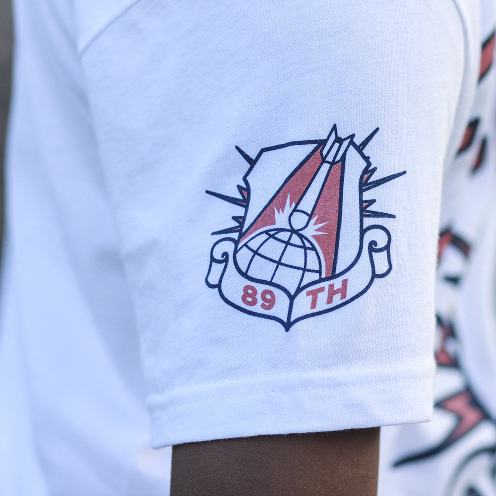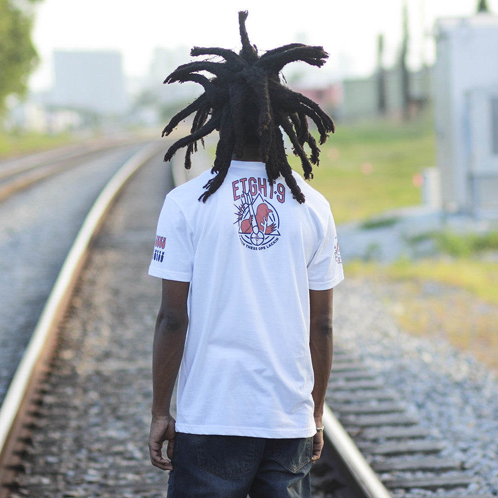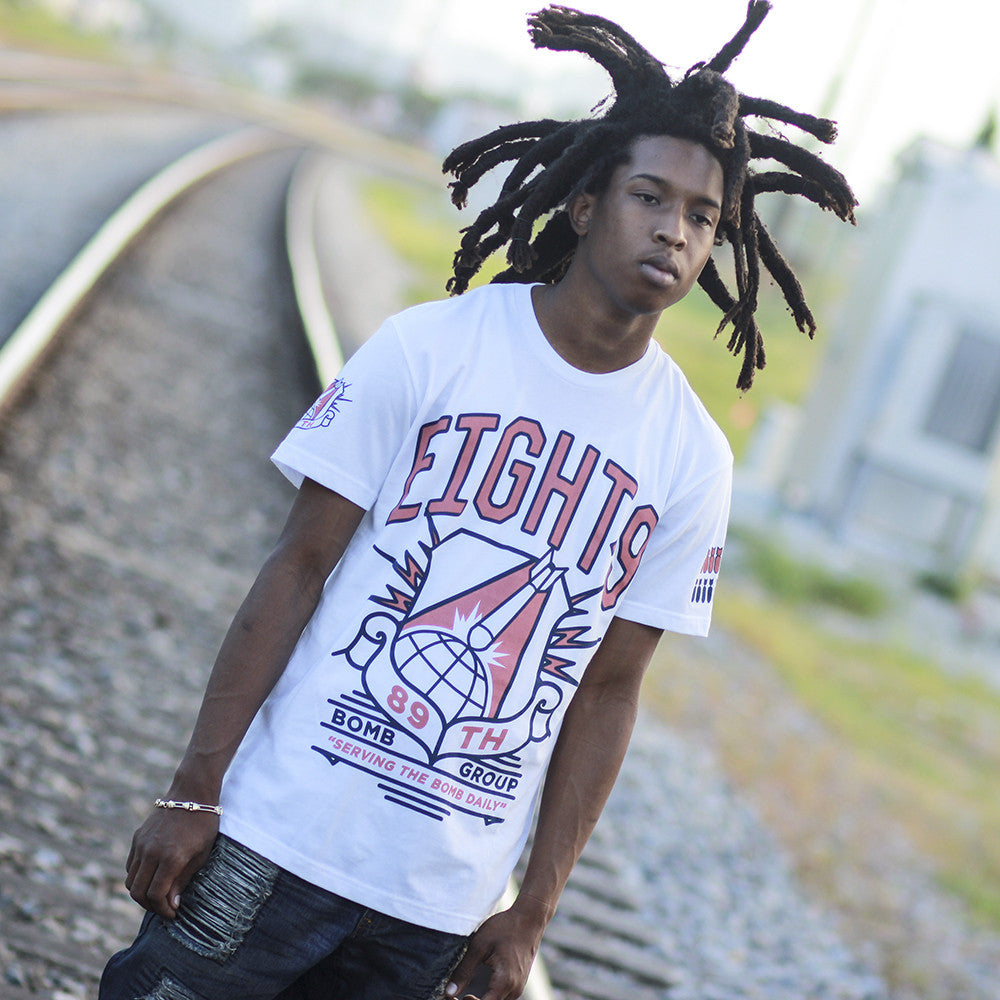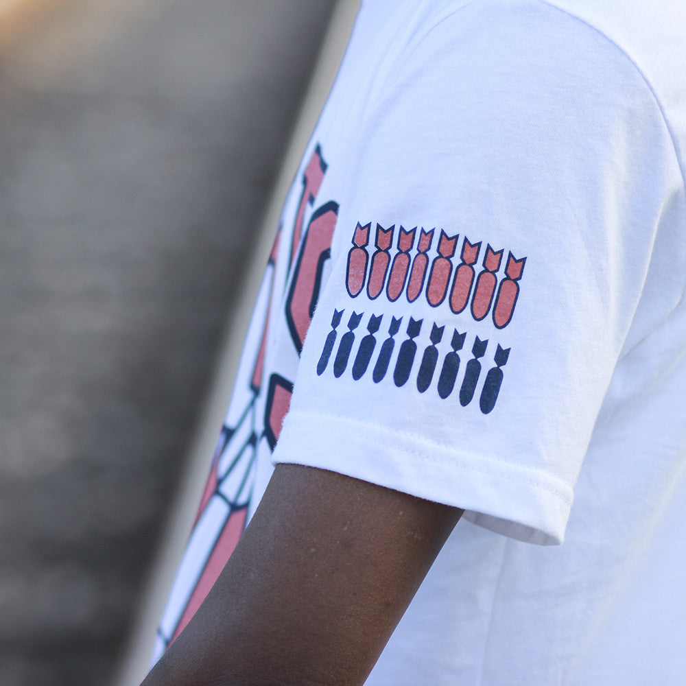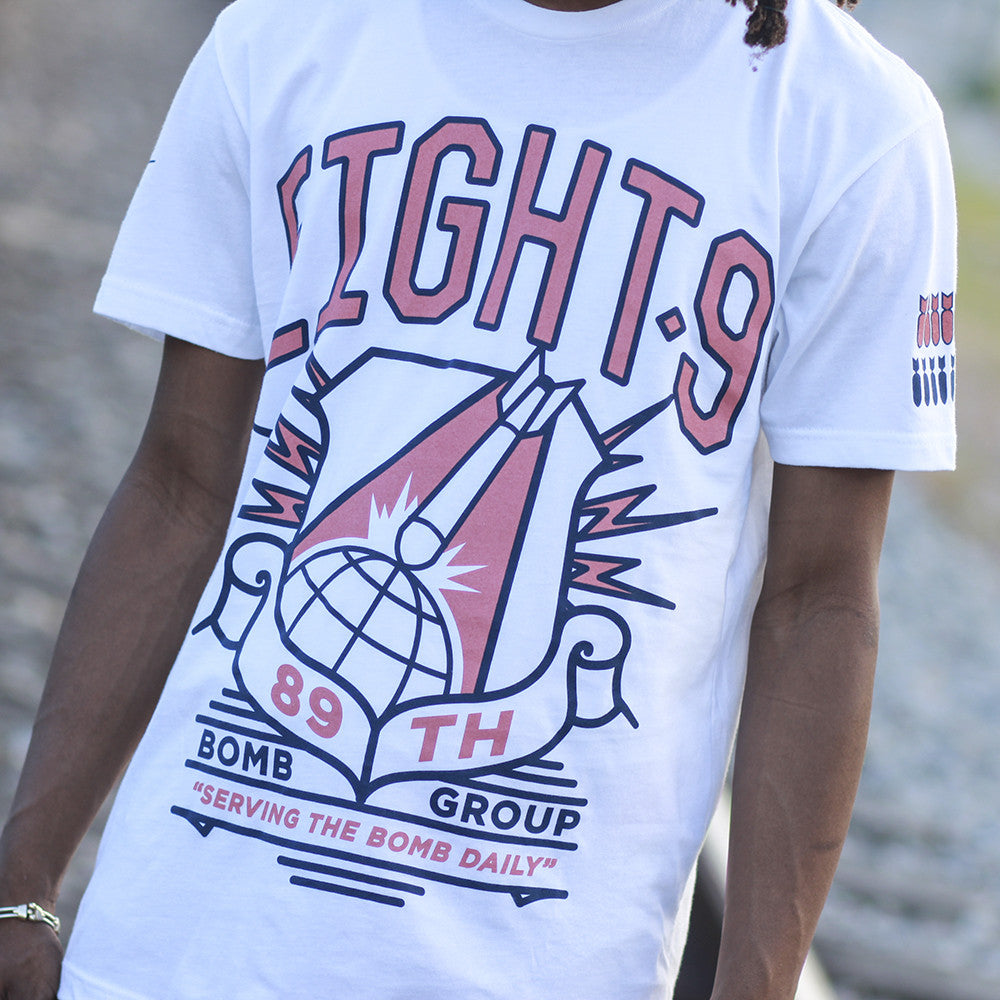 "Serving The Bomb Daily" Bomb Group T Shirt White Coral cut from premium ring spun cotton. Peep the details, white with two tone coral hits front back and both sleeves. Inspired by some of the sickest to ever do it. Bomb Group. Get with it.