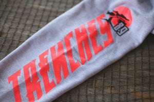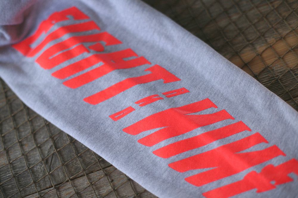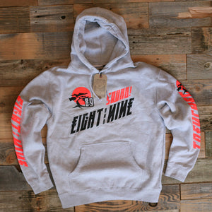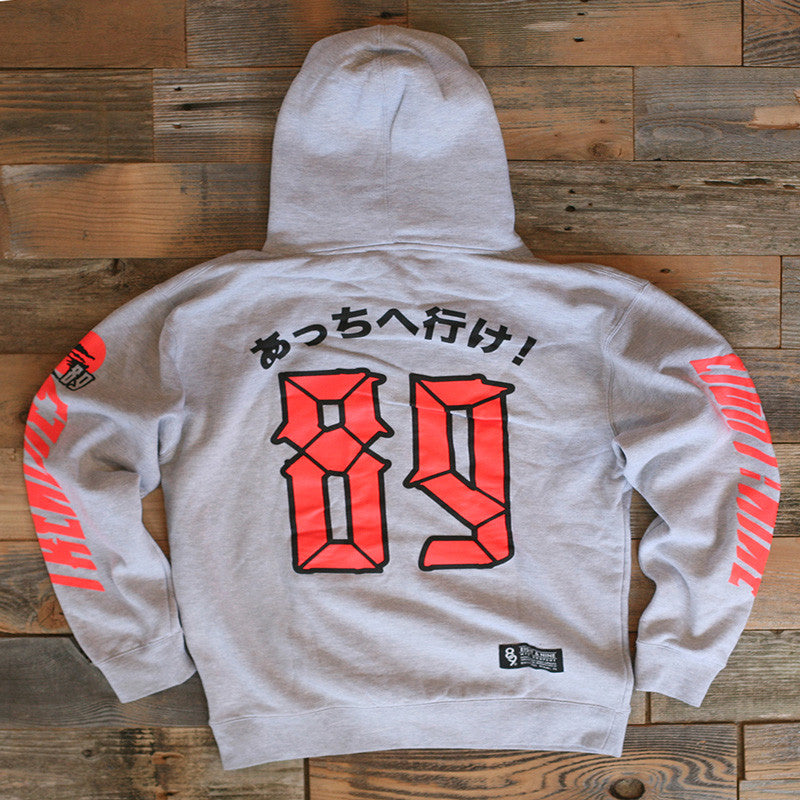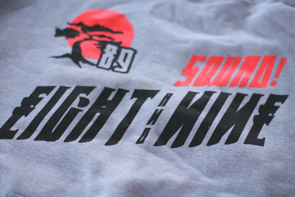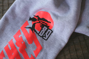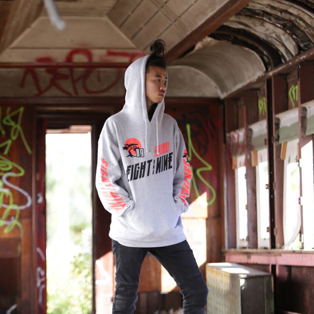 New pullover for holiday Miyagi & Danielson inspired Bonzai Hooded Sweatshirt. Giant front and back prints plus both sleeves. Heather grey/infrared heavyweight hoody. #8and9life