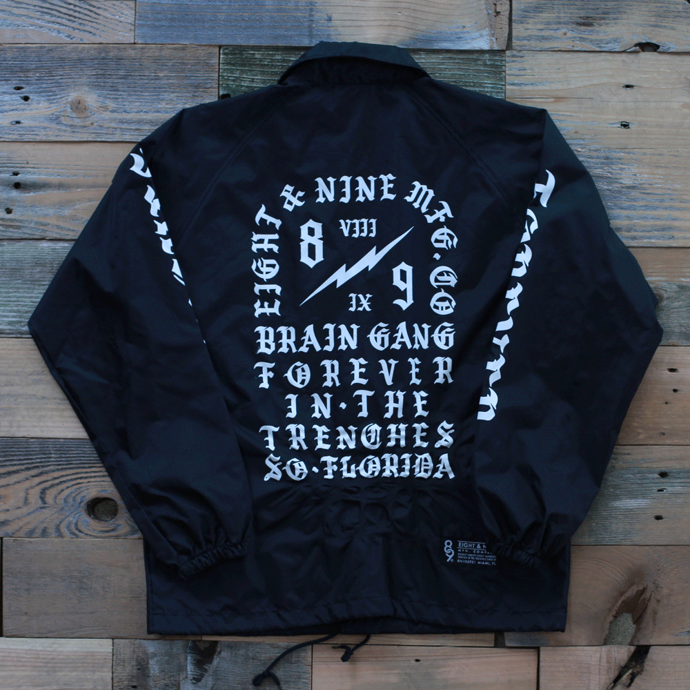 Lightweight for Spring '15. Brain Gang 4 Eva Coaches Jacket Black with front, back, and sleeve hits. 100% Nylon water repellant windbreaker. Black and white color scheme.