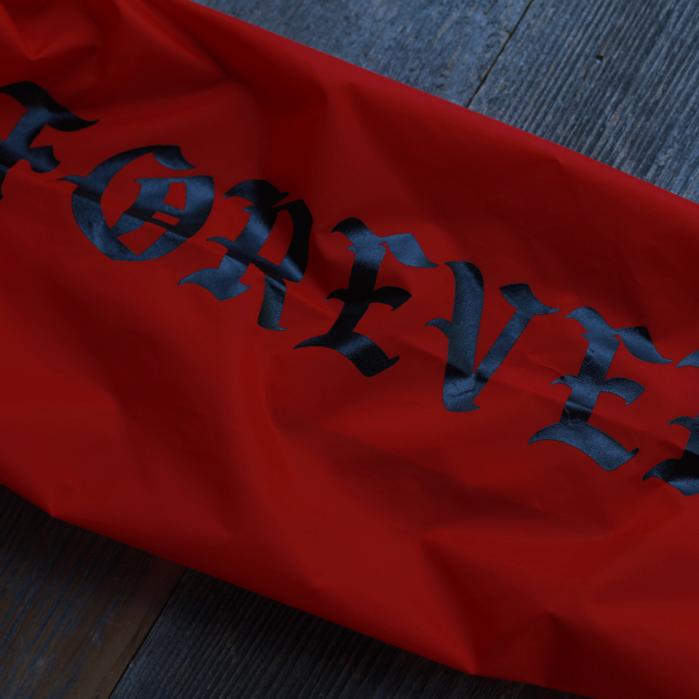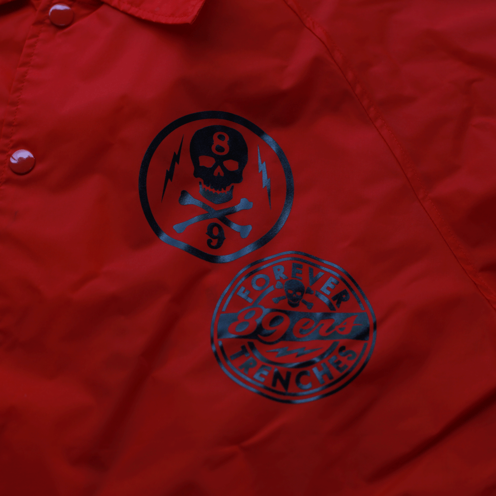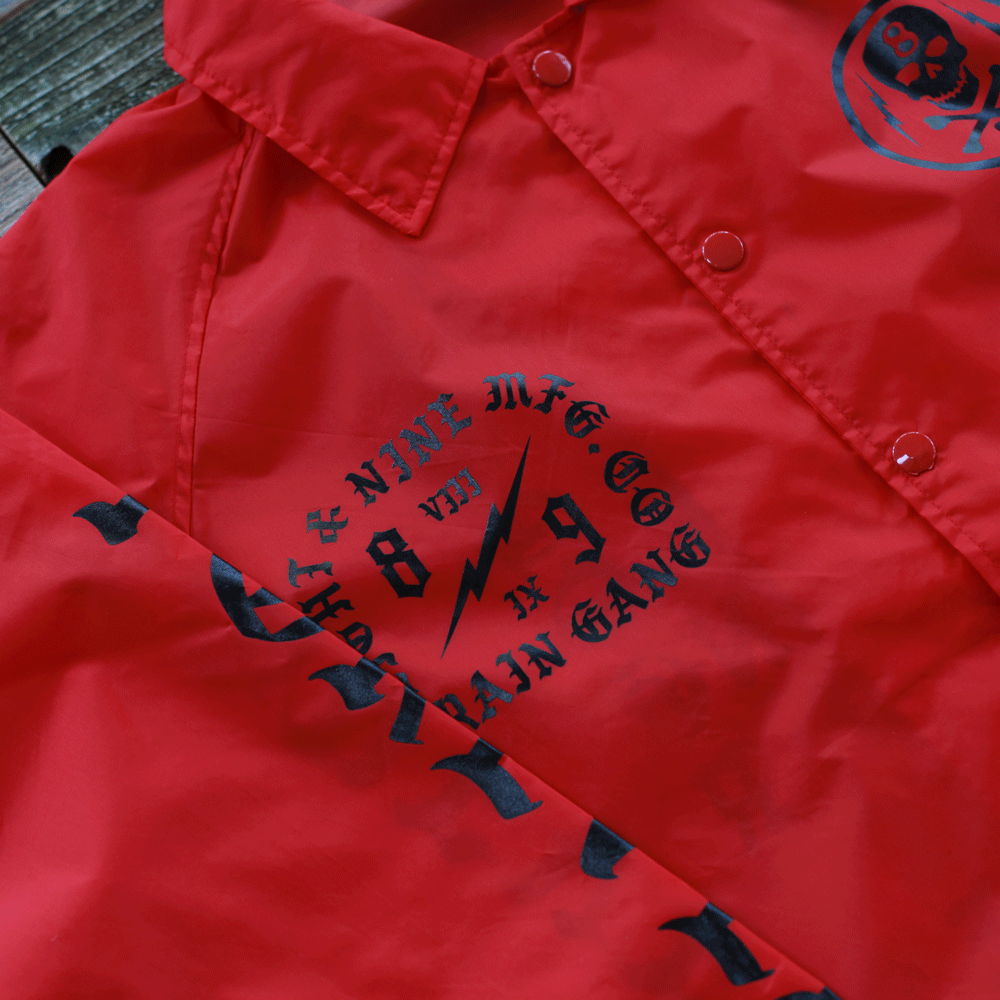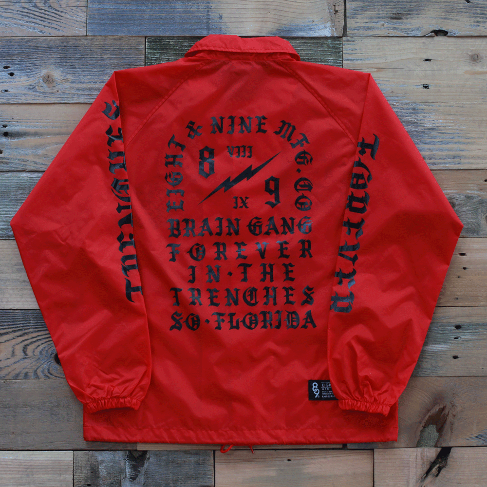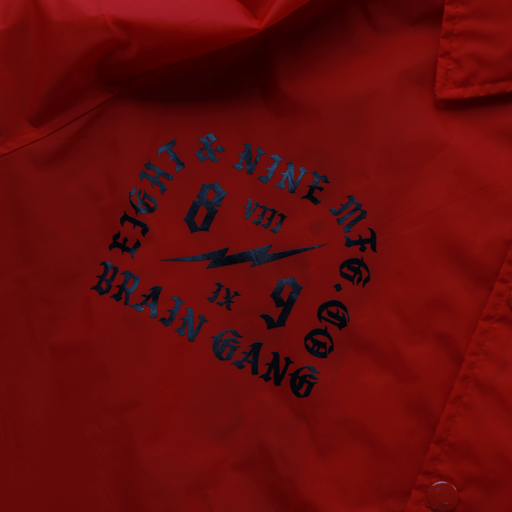 Lightweight for Spring '15. Brain Gang 4 Eva Coaches Jacket Red with front, back, and sleeve hits. 100% Nylon water repellant windbreaker. Fire red and black color scheme.