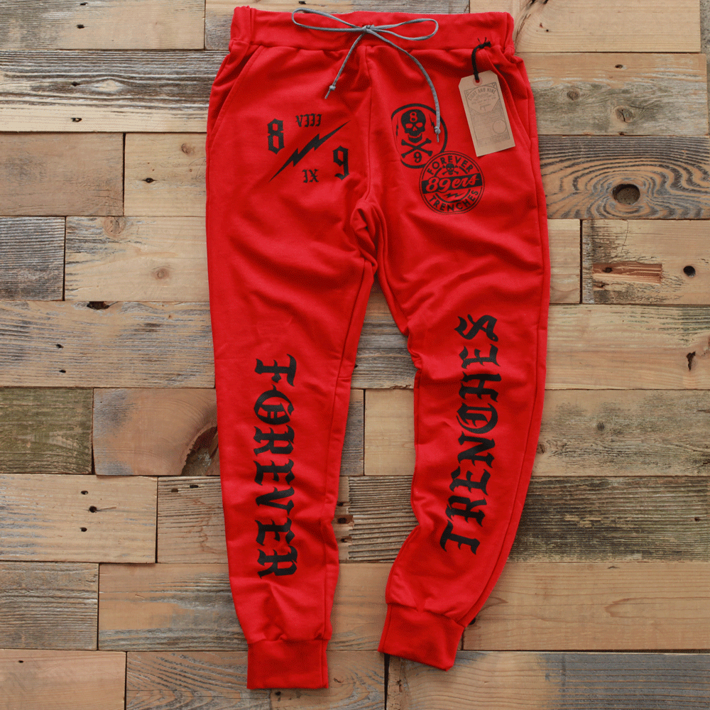 New for Spring '15. Brain Gang 4 Eva Yard Sweats. Classic fire red color scheme. Perfect sweats to match Jordan Chicago 10 Double Nickel and more. Super luxe 100% cotton french terry sweat pants made in the USA. Modern tailored fit. Slight drop crotch. #8and9life