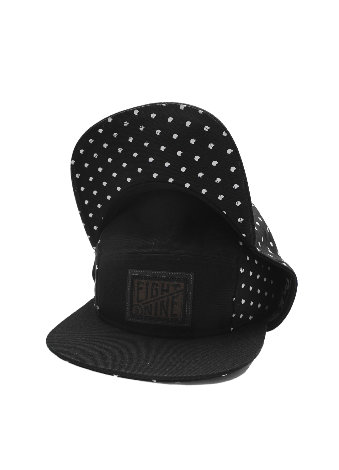 Flat brim 5 panel adjustable hat; contrast Brain Gang print side panels & under brim. stitched eyelets; leather Eight & Nine logo patch on front; adjustable strap w/ metal buckle closure; S logo tag in back; 100% cotton.