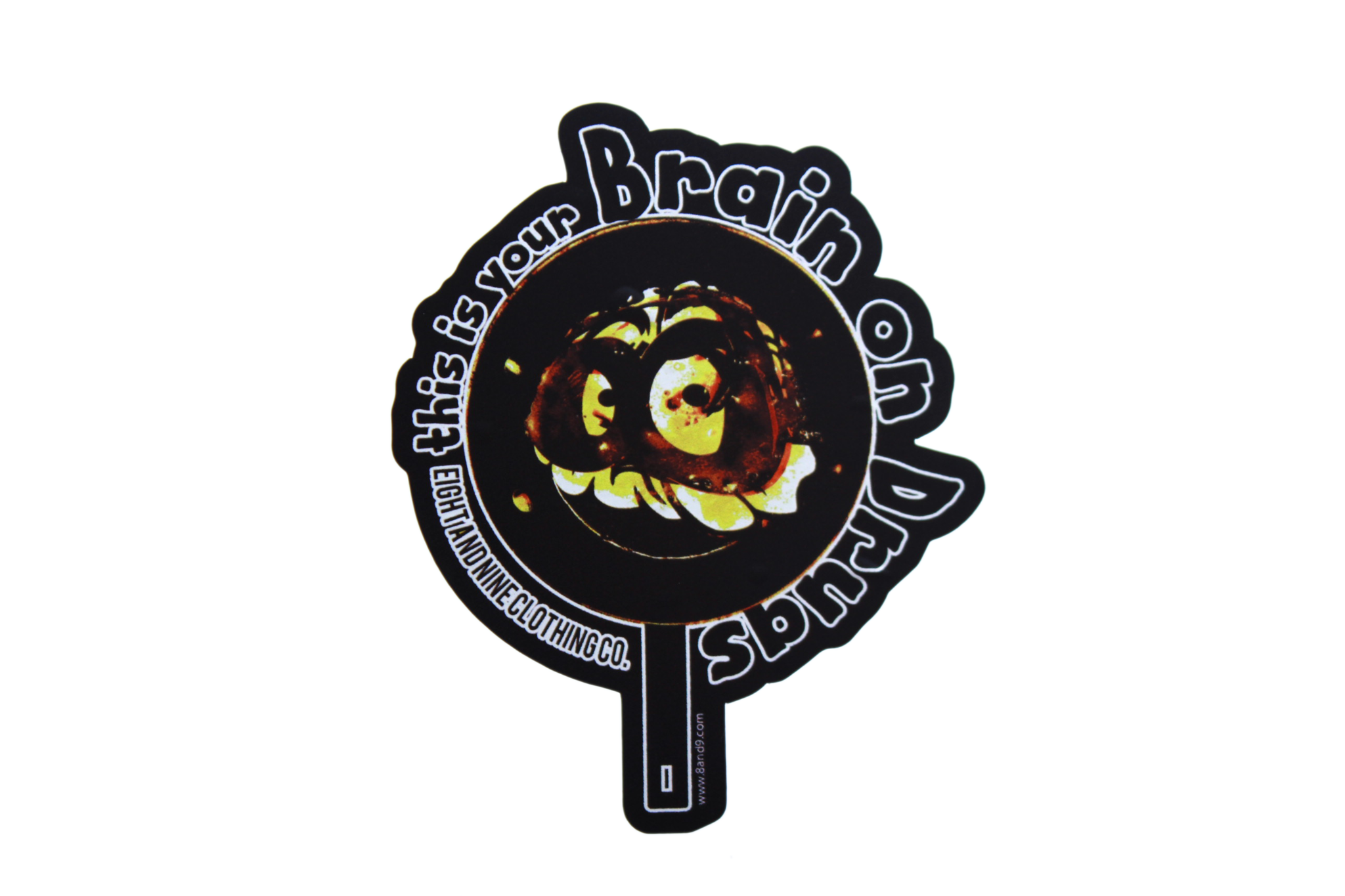 Brain On Drugs Frying Pan Sticker. The sticker is Die Cut 4 inches. Sneakerheads and streetwear feigns there's no better way to rep your favorite brand than by slapping a sticker on your board, laptop, notebook or car. You've been asking us and we're answering your call with tons of new sticker styles.