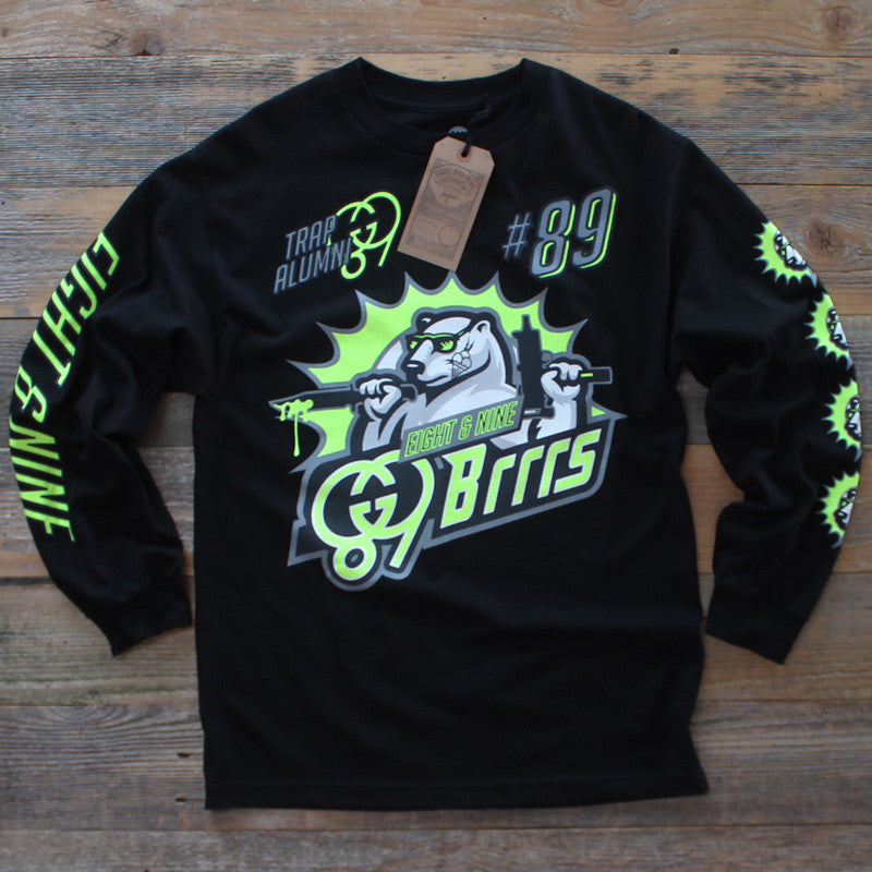New for Spring '15, Brrrs long sleeve jersey tee. Art inspired by the Orlando Solar Bears hockey team and Gucci Mane. Brrrs jersey black/volt color scheme. Easily match any Volt colorway inspired releases including Nike Air Max 95, Foamposites and more! Get yours. #8and9life
