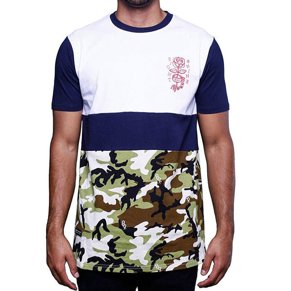 New premium cut & sew garment for Fall '16. Camo Rosa Tee. Paneled white with navy and camo accents, gold Rosa. Peep the details, super premium, modern fit, great look for Fall 2016 as a stand alone or layering piece under any jacket.