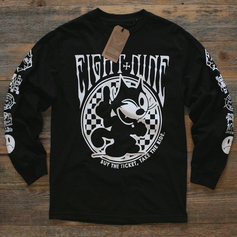 Long sleeve, 'Cid Cat Jersey Tee. "Buy the ticket, take the ride" black and white color scheme. Front back and both sleeve hits. Winter '14 #8and9life