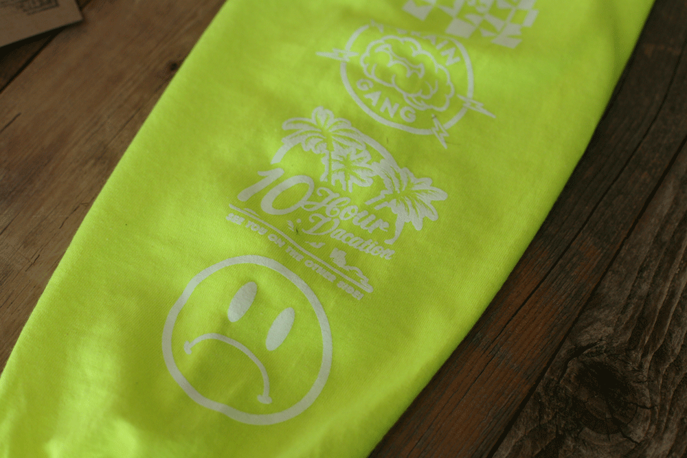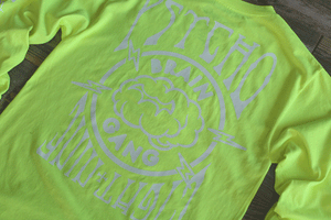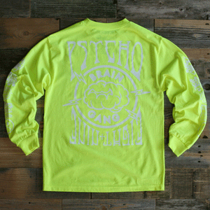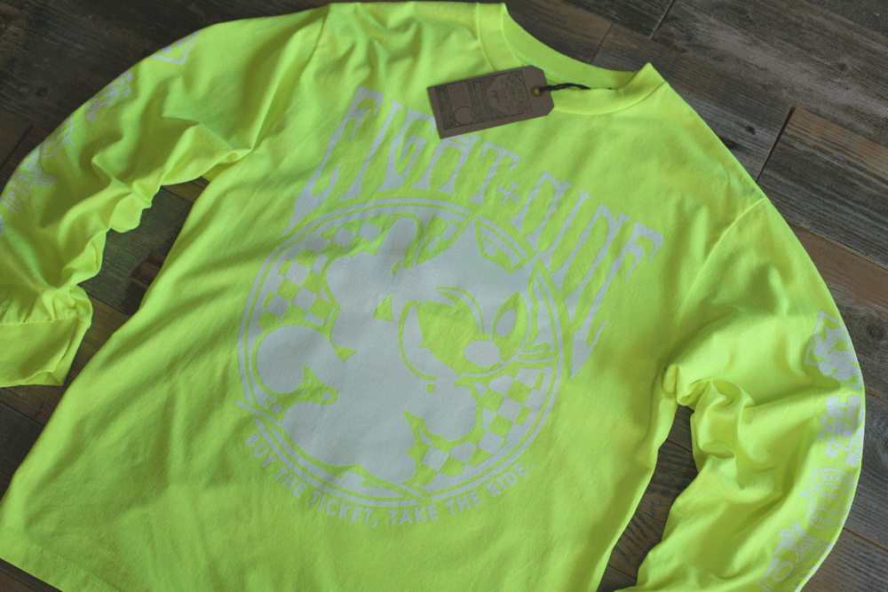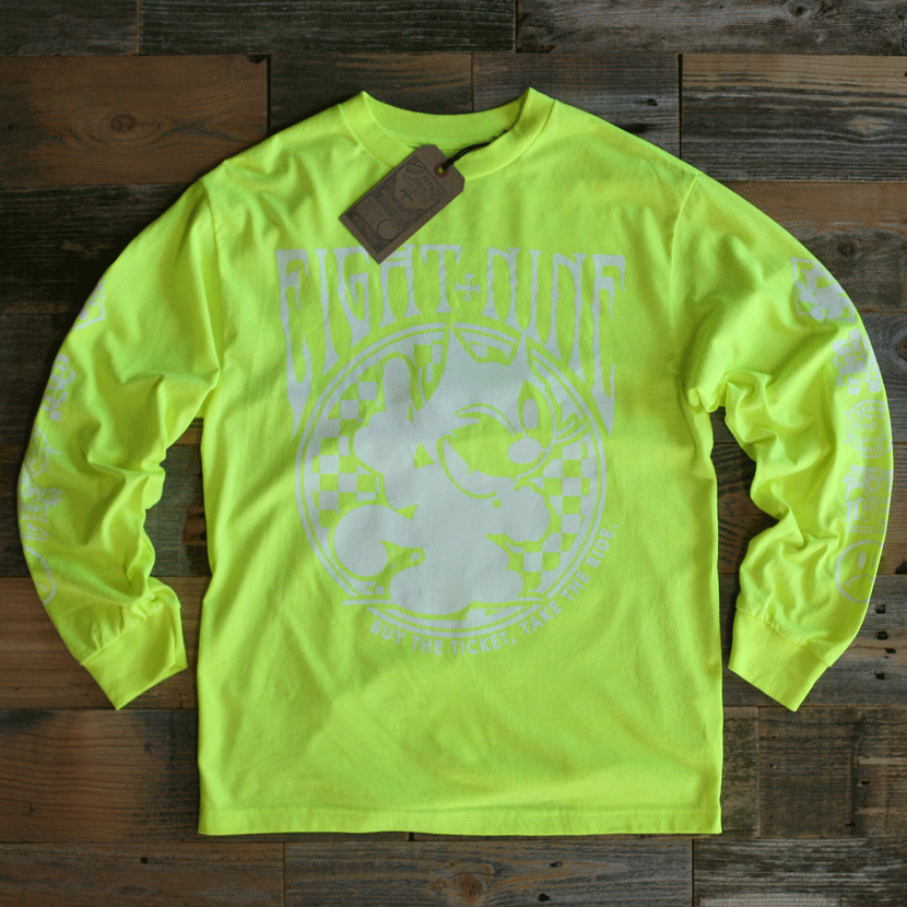 Long sleeve, 'Cid Cat Jersey Tee. "Buy the ticket, take the ride" volt and blended white color scheme. Perfect shirt to match the Nike Foamposite Volt release. Front back and both sleeve hits. Winter '14 #8and9life