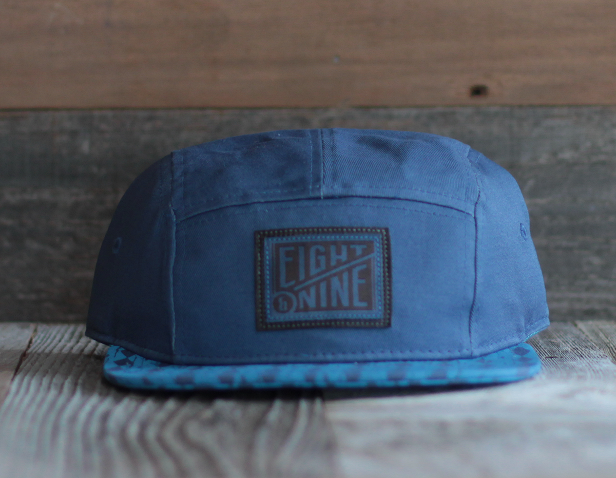 Flat brim 5 panel adjustable hat with Slate/Carolina cracked print visor. Top and under visor are printed. Stitched eyelets; Eight & Nine leather logo patch on front; adjustable strap w/ metal buckle closure; S logo tag in back; 100% cotton.