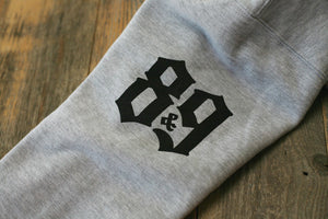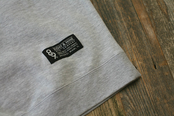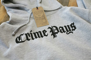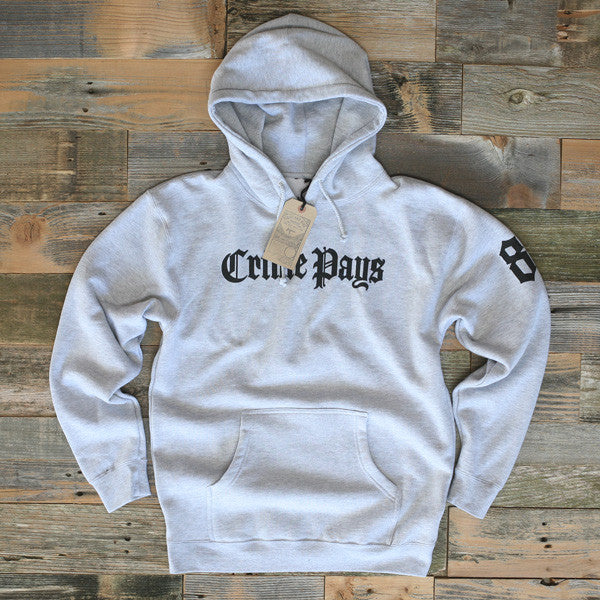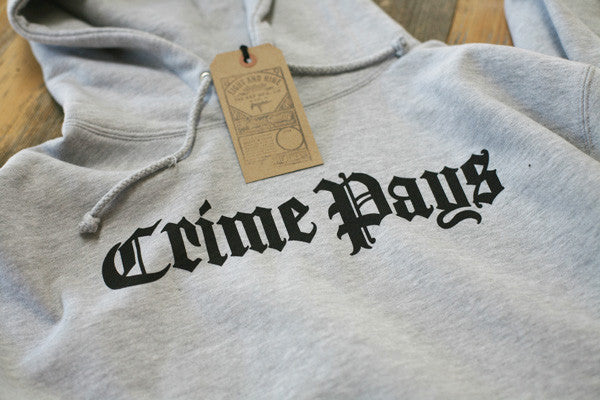 Heavyweight premium fleece hoody for Winter '14. Inspired by the original Miami Vice graphic. Heather grey and black. Crime Pays. OE front, sleeve hit.