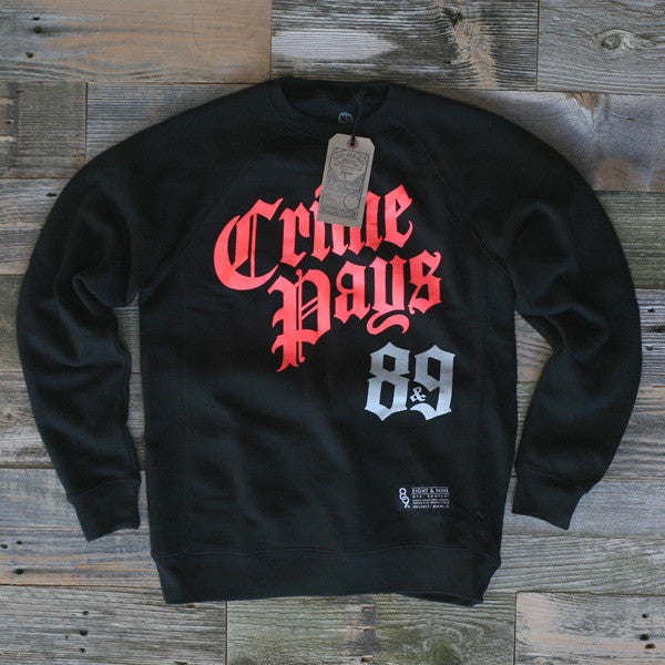 New for winter '14 Crime Pays Crewneck Sweatshirt. Premium jet black fleece, raglan sleeves, infrared and silver print. Perfect sweatshirt to match Jordan Infrared 13 and Jordan Infrared 6.