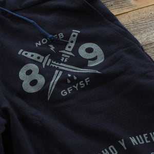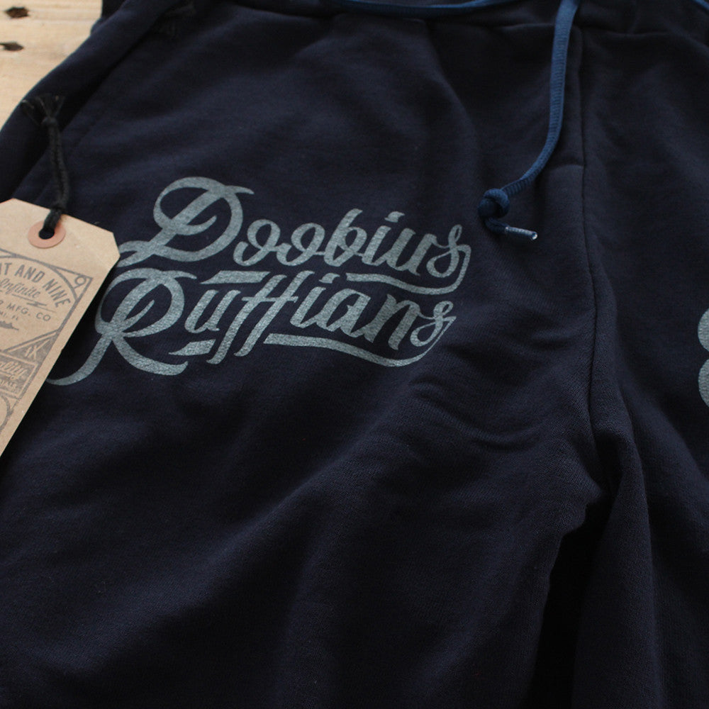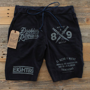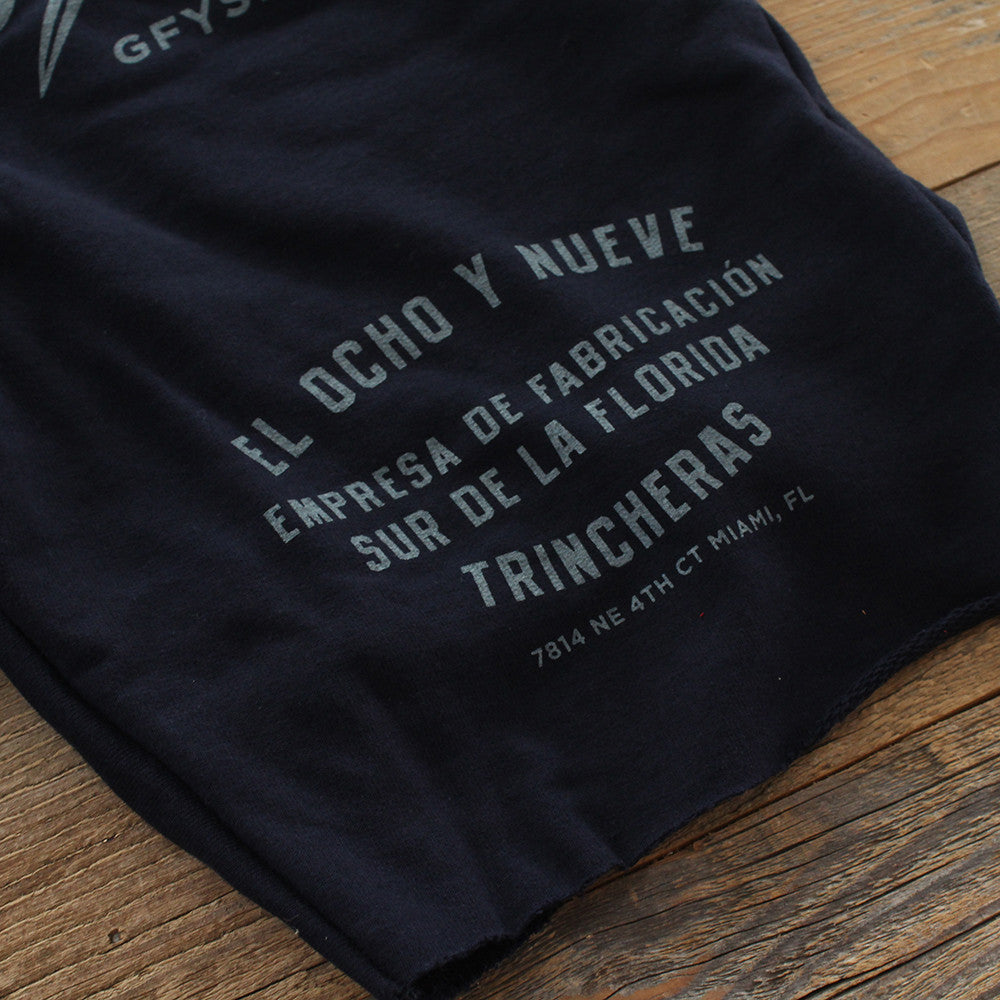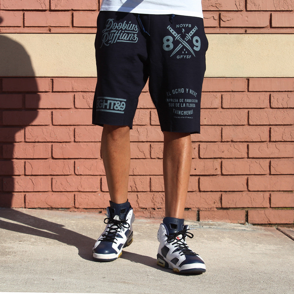 New cut offs for summer. Inspired by the trench life. Doobius Ruffians. NOYFB. Navy/Dark Grey, Super luxe 100% cotton french terry shorts made in the USA. Modern tailored fit, cut off styling w/ raw edge. Slight drop crotch, sneaker lace drawstring. #8and9life