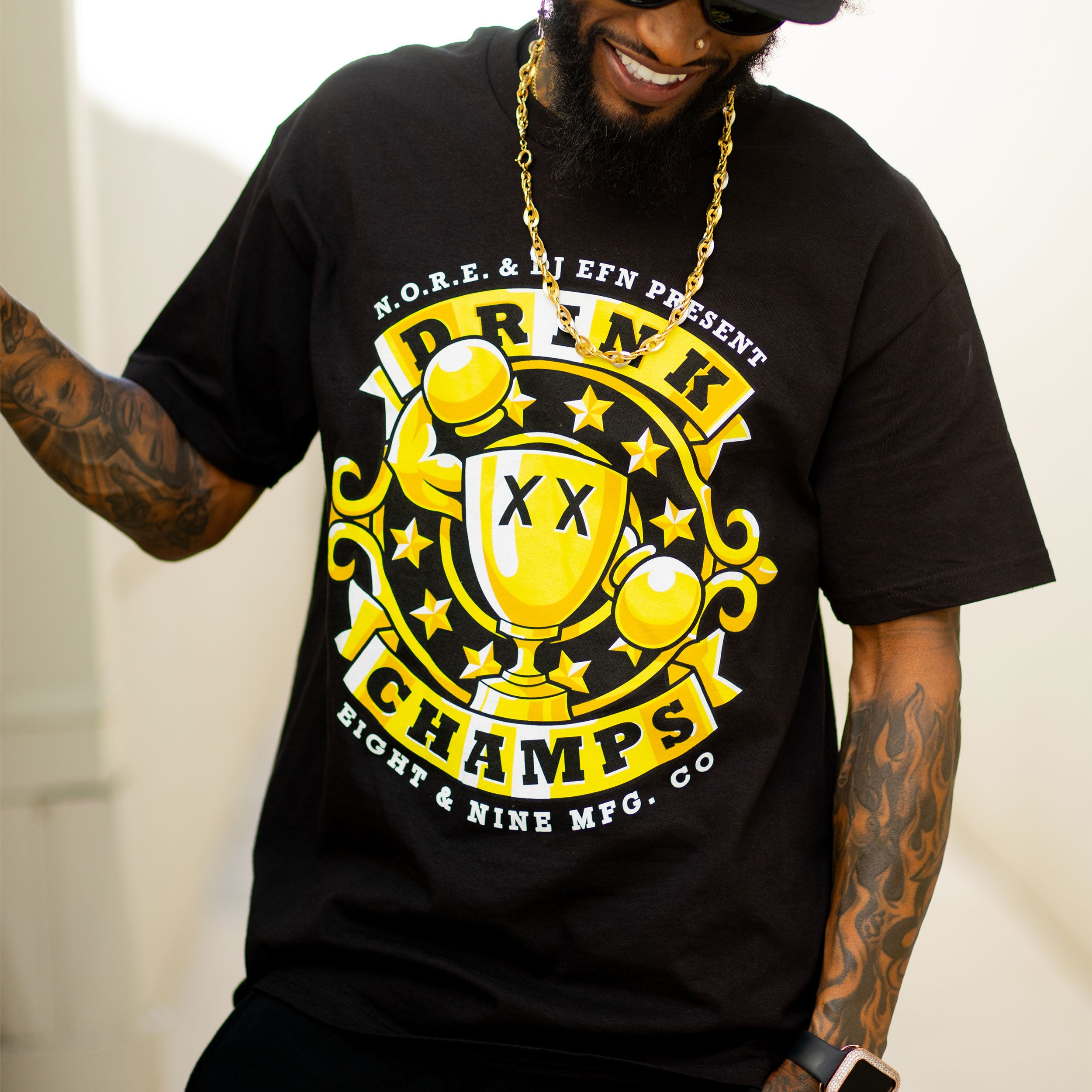 The official Drink Champ uniform, OG design in gold on black. You know what it is, legendary Queens rapper and one half of Capone-n-Noreaga N.O.R.E. alongside Miami hip-hop pioneer DJ EFN coming together as the Drink Champs! Make Some Noiiiiise for the original Skam2 Drink Champs logo and this premium black tee to luxe up your week! Available in limited quantities. S-4X. Grab one.