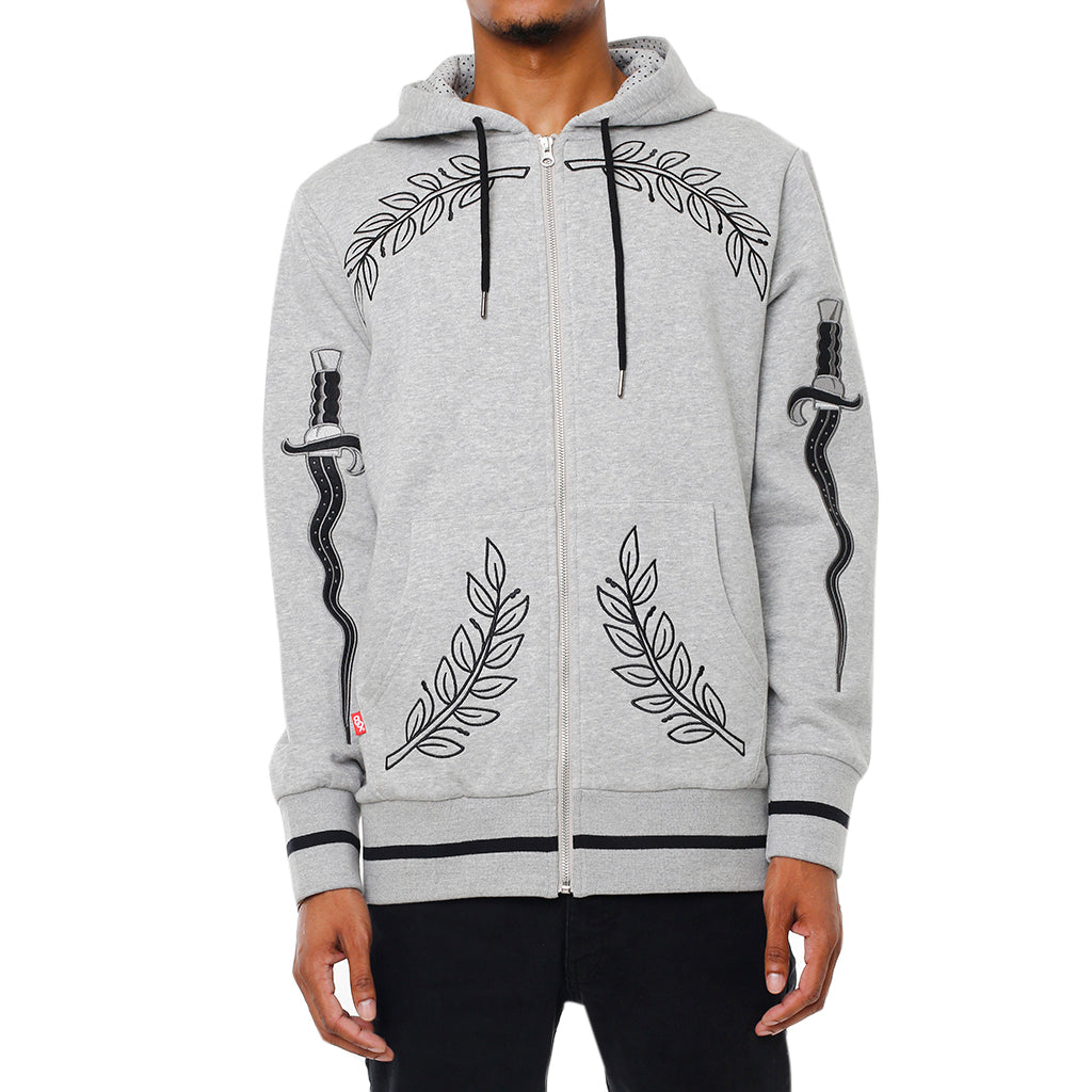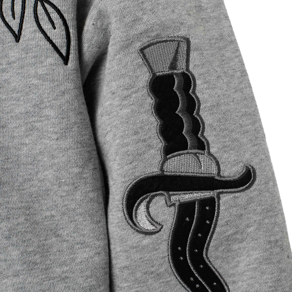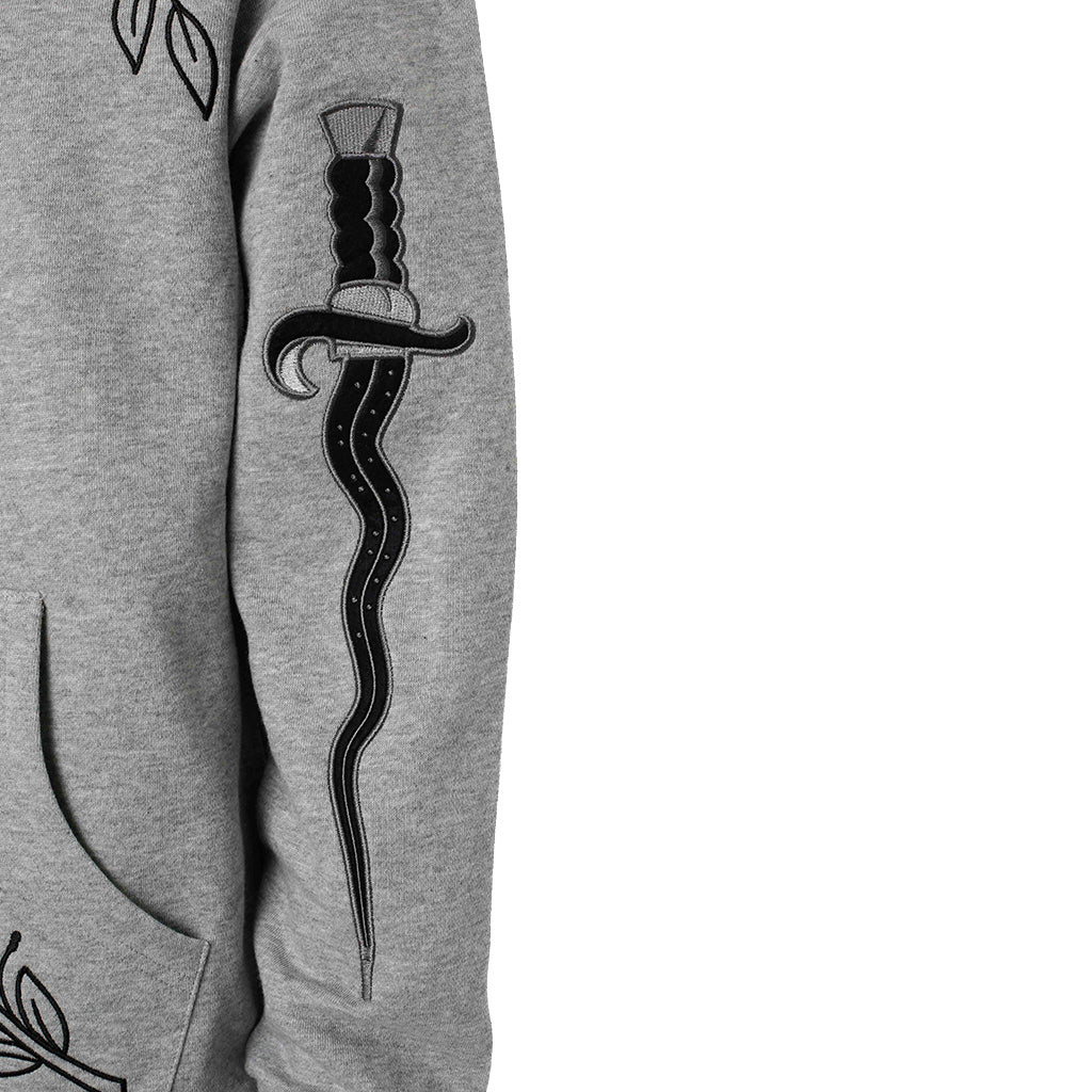 Premium cut & sew hoodie, completely tricked out and built from the finest fleece man can source, heavy black and grey embroideries on the chest, sleeves and lined hood. The Eulogy Embroidered Hooded Sweatshirt in heather grey is a men's streetwear staple, this premium hoodie is well tailored with all the next level details. Check it out. You need one.