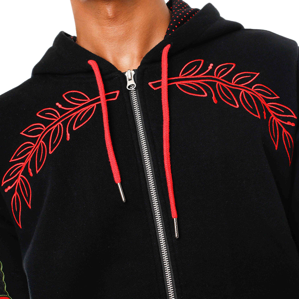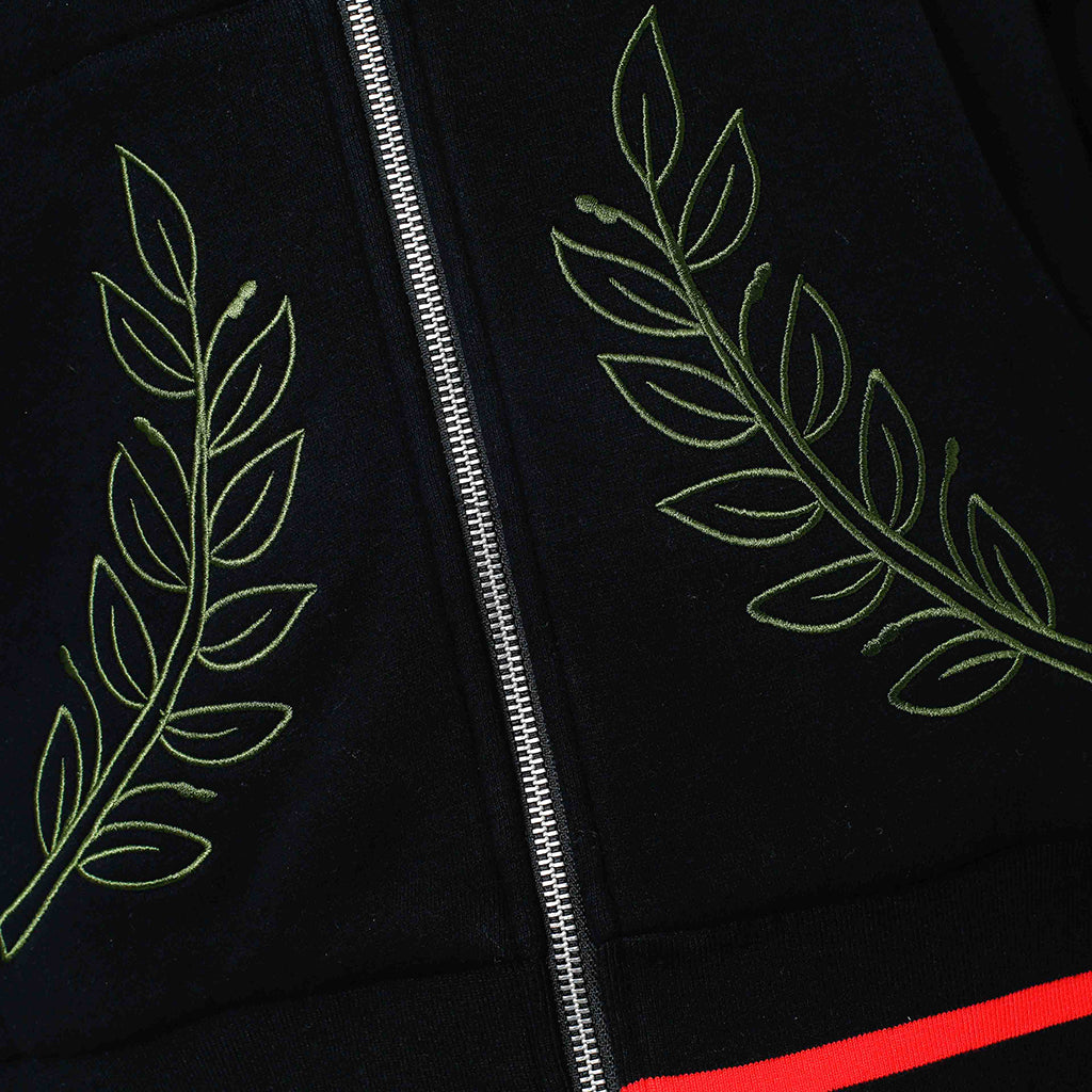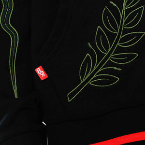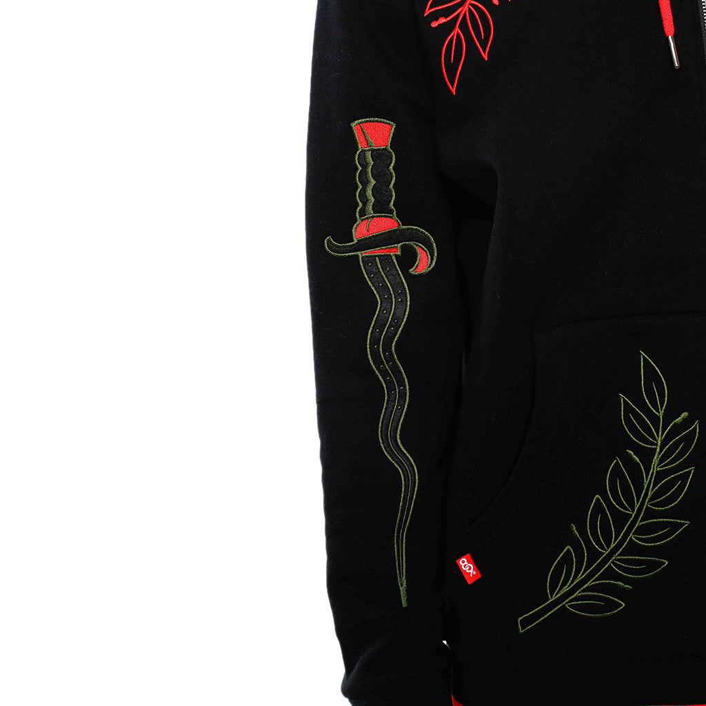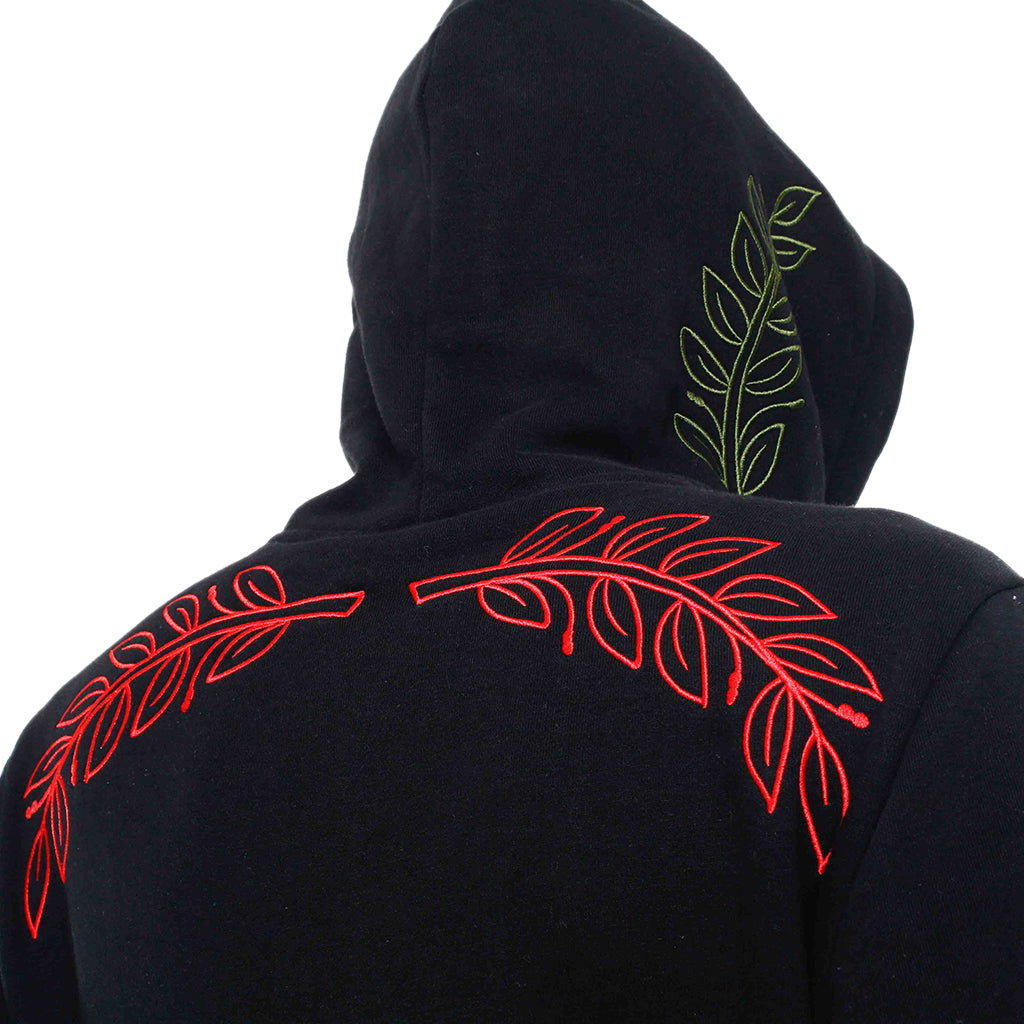 Premium cut & sew hoodie, completely tricked out and built from the finest fleece man can source, heavy red and green embroideries on the chest, sleeves and lined hood. The Eulogy Embroidered Hooded Sweatshirt in black is a men's streetwear staple, this premium hoodie is well tailored with all the next level details. Check it out. You need one.