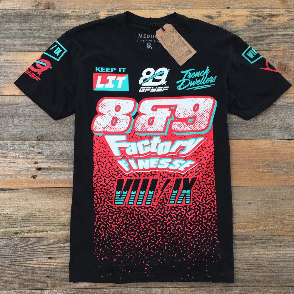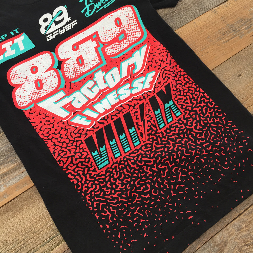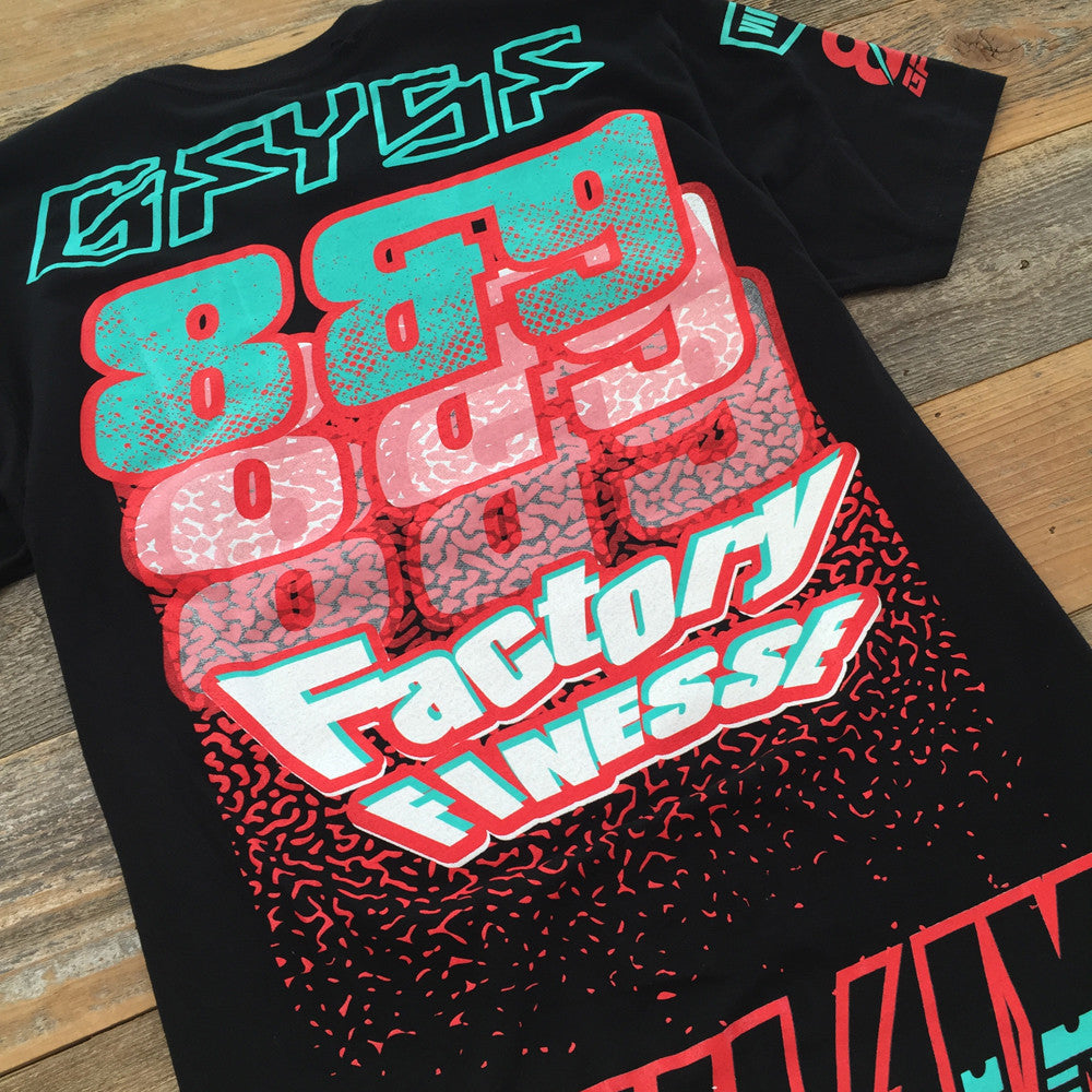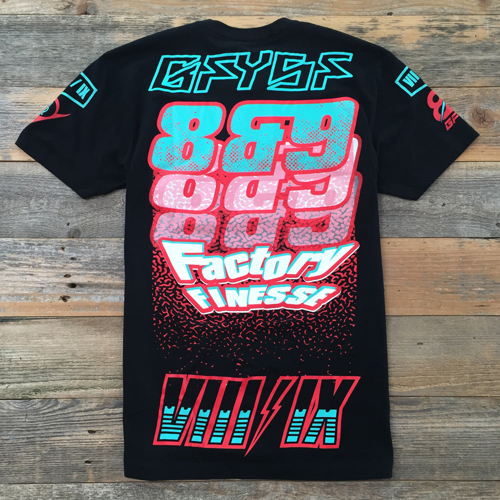 New BMX inspirations for Summer '15, Factory Jersey in black. Keep it lit, 90's Summer time BMX vibes, peep the details on the Factory Jersey, jumbo front and back prints with multiple hits. Premium black cotton with bright red and sea foam #8and9life
