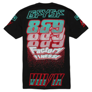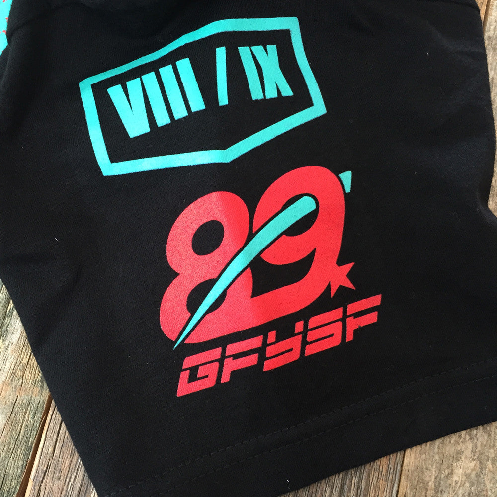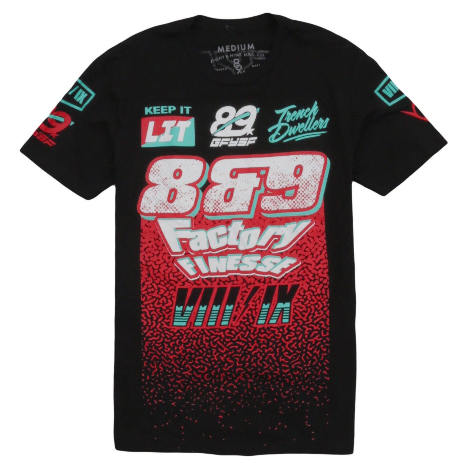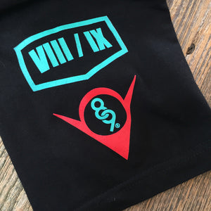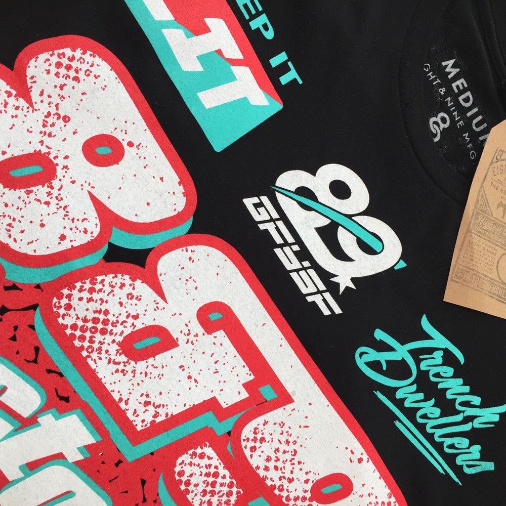 New BMX inspirations for Summer '15, Factory Jersey in black. Keep it lit, 90's Summer time BMX vibes, peep the details on the Factory Jersey, jumbo front and back prints with multiple hits. Premium black cotton with bright red and sea foam #8and9life
