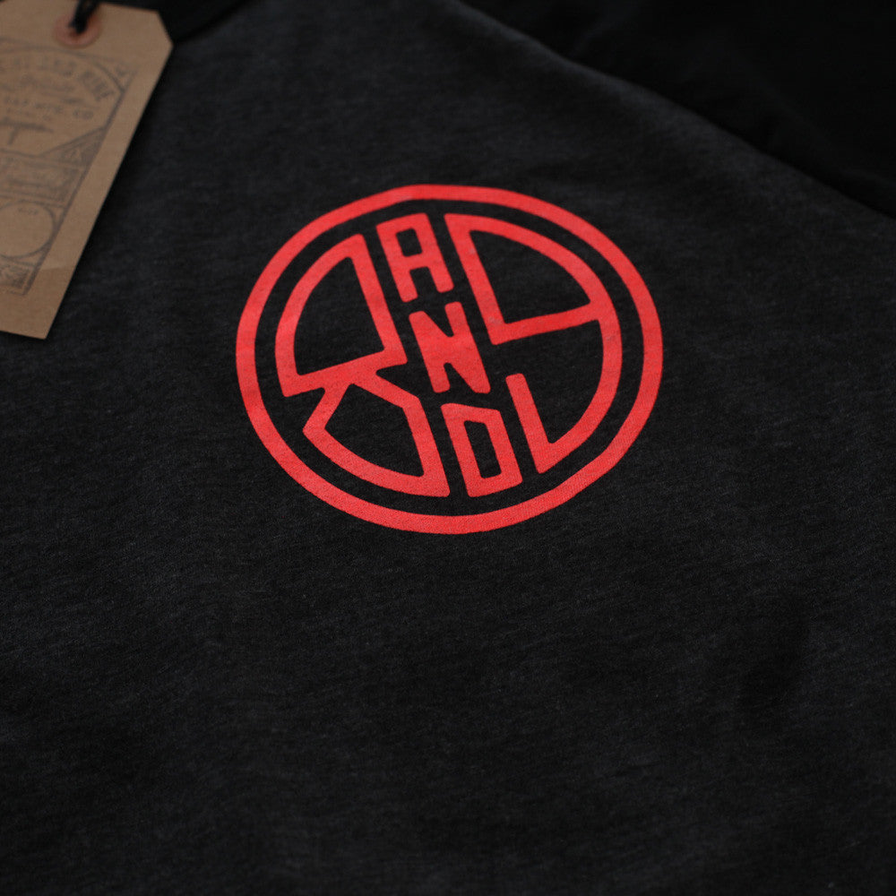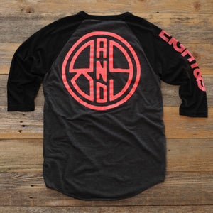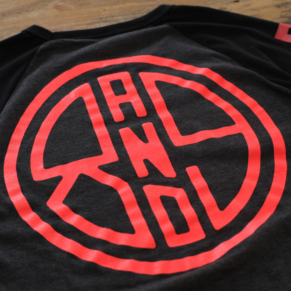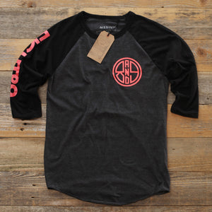 New for Spring '15 Finish Line graphic. Sporty clean, simplicity reigns supreme. Super soft 3/4 sleeve premium raglan baseball tee w/ round bottom, charcoal body, black contrast sleeves, and infrared details. Great choice to match Jordan Infrared 6s. #8and9life
