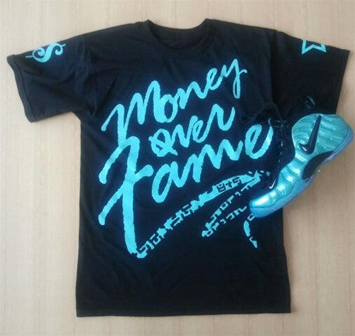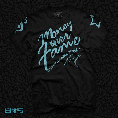 Nike Air Foamposite Pro Retro Blue aka Electric aka Aqua aka South Beach aka Teal release date is set for July 1. This Money Over Fame t shirt is guaranteed to be the best match you'll find anywhere for the Retro Blue Foams. This shirt is a perfect match for the Retro Blue Foams Money Over Fame Black T Shirt w/ a custom Retro Blue Print. Dollar Sign on one sleeve Hollywood Star on the other. The choice is easy, Money Over Fame, get your shirt to match Retro Blue foamposites Pros from us.Highest quality print on our signature Fit Short Sleeve Crew Neck T-shirt - Constructed with side seams for perfect no twist drape. You'll appreciate the cut right before you become addicted. Impeccable quality 6 oz. 100% Cotton Tubular Jersey. Double-stitched. Shoulder-to-shoulder tape. Preshrunk.Street Wear, underground, hip hop, skate inspired clothing by Eight & Nine Designs. 8&9 Clothing: Redefining style, thought and motivation.