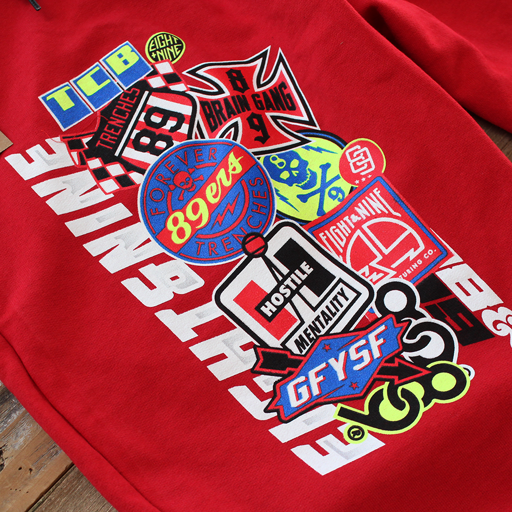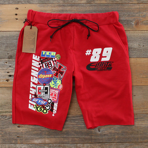 New cut off french terry shorts. Garage Built. Shop inspired, sticker slaughtered. Super luxe 100% cotton french terry shorts made in the USA. Modern tailored fit, cut off styling w/ raw edge. Slight drop crotch, sneaker lace drawstring and multi color print. #8and9life