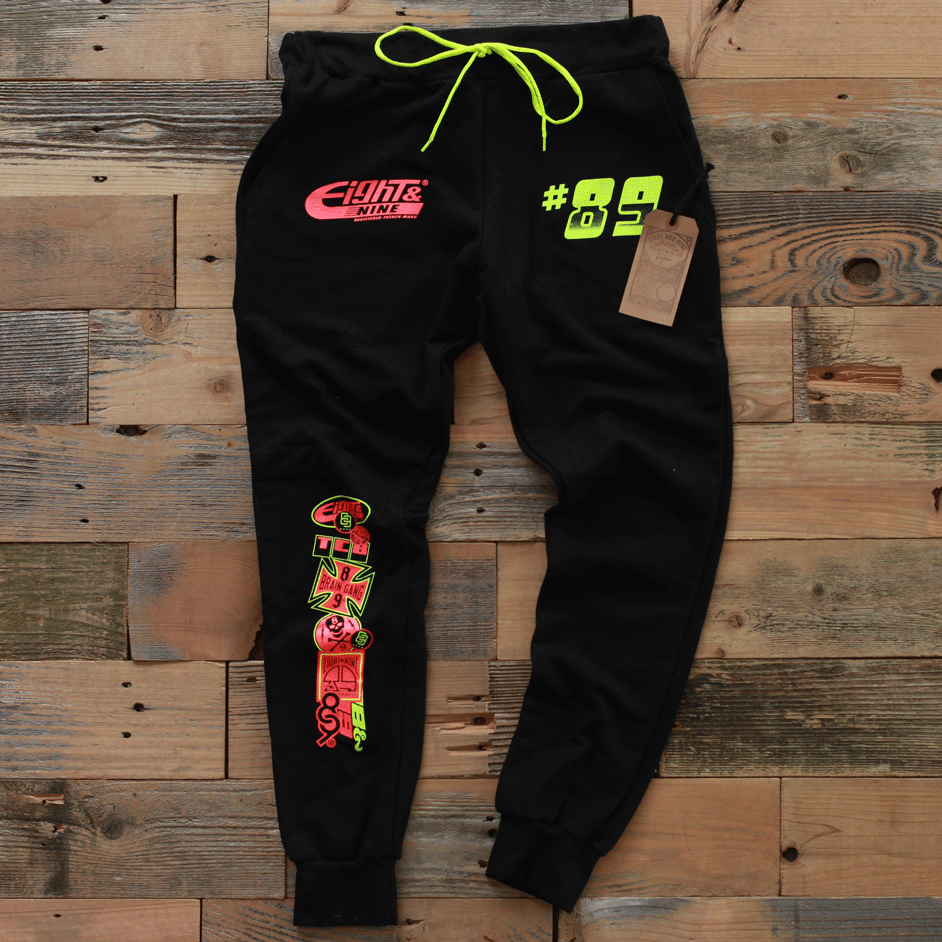 New for Spring '15. Garage Built Yard Sweats. Classic volt and infrared color scheme. Slaughtered sticker blasted styling. Super luxe 100% cotton french terry sweat pants made in the USA. Modern tailored fit. Slight drop crotch, great sweatpant to match the Garage Built Neon long sleeve tee. #8and9life