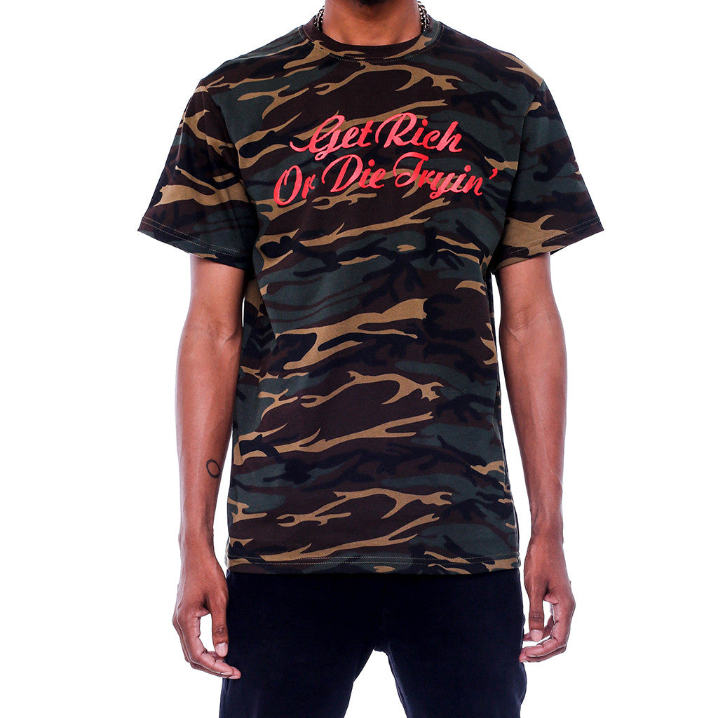 Classic hip hop piece on camo! Remember when the mixtape hype bubbled and this one dropped? "Get Rich Or Die Trying'" the sentiment still rings strong. Premium ring spun cotton, black and white color scheme.
