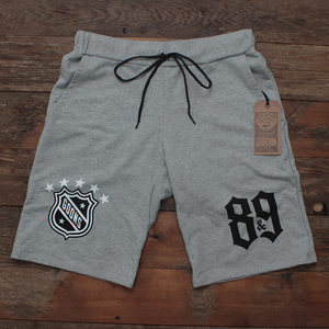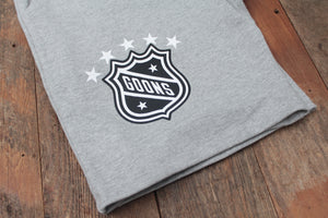 Goons. Super luxe 100% cotton french terry sweat shorts made in the USA. Heather Grey w/ black Goons logo and #89 hit matching SB shoe lace draw string. Modern tailored fit. Slight drop crotch. #8and9life