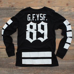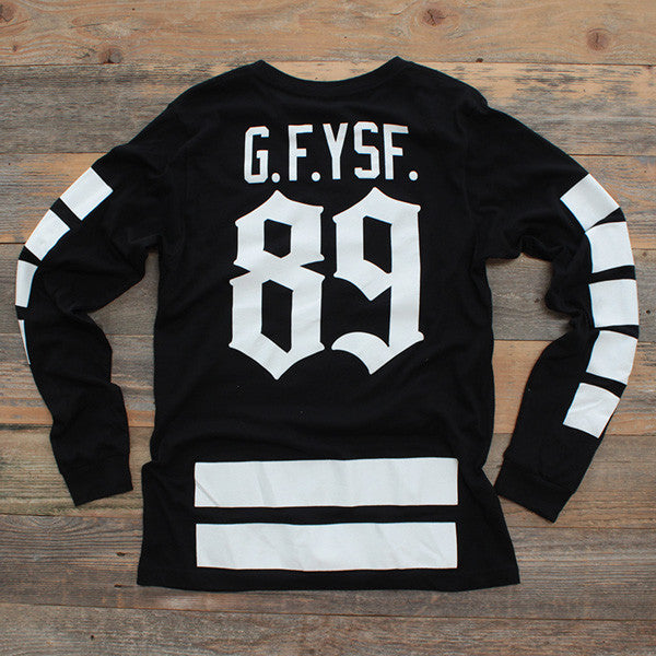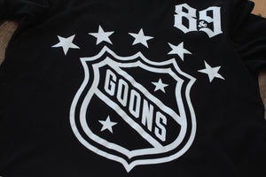 New for Fall '14 ice hockey inspired Goons Long Sleeve Jersey Tee. Super classic black/white color scheme. Goons Jersey Crest 89 and the G.F.YSF. name plate. #8and9life Get this one while you can. Certainly won't last long.
