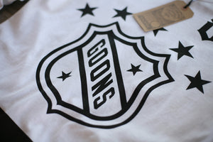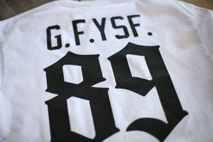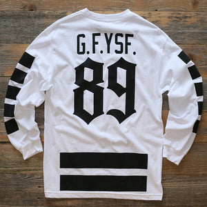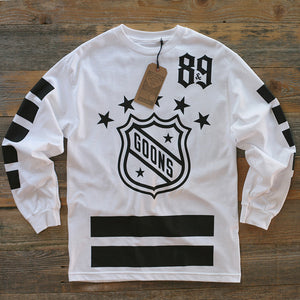 New for Winter '14 ice hockey inspired Goons Long Sleeve Jersey Tee. Super classic white and black color scheme. Goons Jersey Crest 89 and the G.F.YSF. name plate. #8and9life Get this one while you can.
