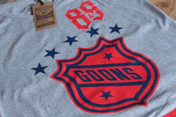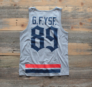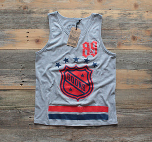 2014 playoff hockey inspired Goons Jersey Tank Top. Cement/Bright Red/Navy scheme. Goons Jersey crest 89 and the G.F.YSF. name plate. Infinite Supply #8and9life