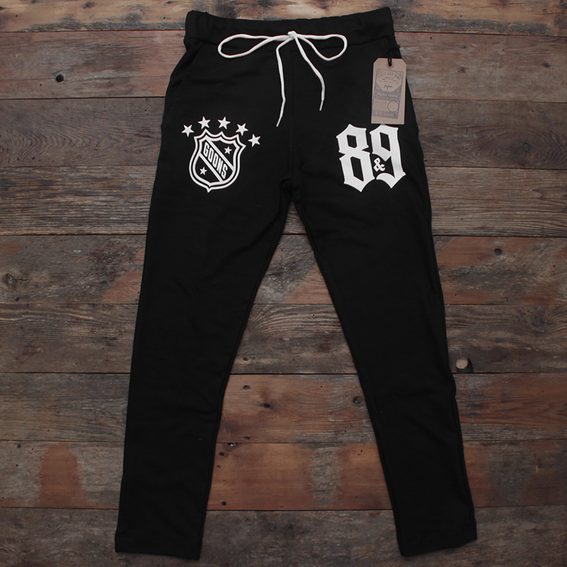 Fall 2014 modern tailored fit, no cuff super luxe 100% cotton french terry sweat pants made in the USA. Black and white Goons w/ #89 hit and contrast SB shoe lace draw string. Slight drop crotch. This is sure to be a staple in your life. #8and9life
